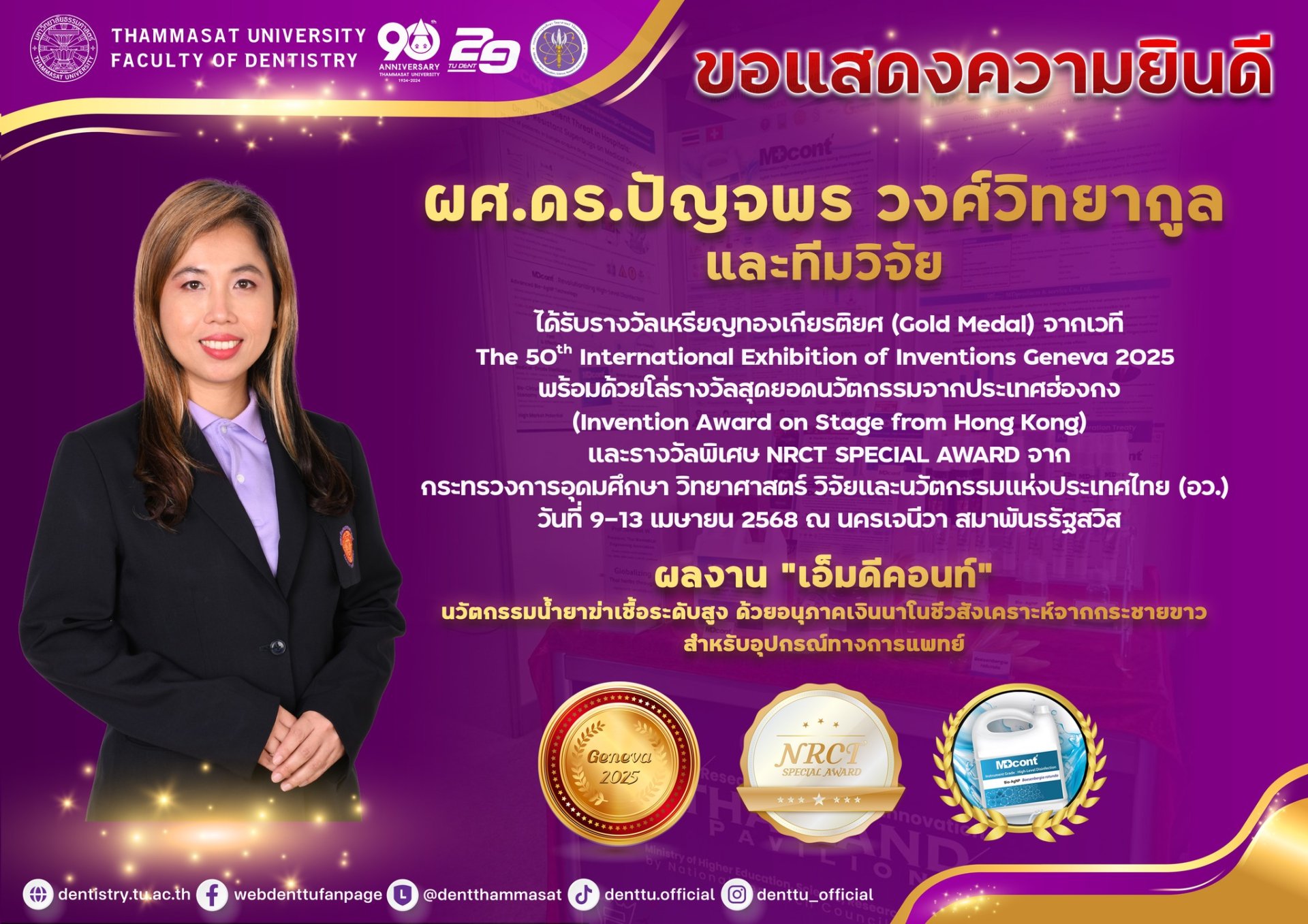 ผศ.ดร.ปัญจพร วงศ์วิทยากูล และทีมวิจัย ได้รับรางวัลเหรียญทองเกียรติยศ (Gold Medal) จากเวที The 50th International Exhibition of Inventions Geneva 2025 พร้อมด้วยโล่รางวัลสุดยอดนวัตกรรมจากประเทศฮ่องกง (Invention Award on Stage from Hong Kong) และรางวัลพิเศษ NRCT SPECIAL AWARD จากกระทรวงการอุดมศึกษา วิทยาศาสตร์ วิจัยและนวัตกรรมแห่งประเทศไทย (อว.) ผลงาน "เอ็มดีคอนท์: นวัตกรรมน้ำยาฆ่าเชื้อระดับสูง ด้วยอนุภาคเงินนาโนชีวสังเคราะห์จากกระชายขาว สำหรับอุปกรณ์ทางการแพทย์" วันที่ 9-13 เมษายน 2568 ณ นครเจนีวา สมาพันธรัฐสวิส