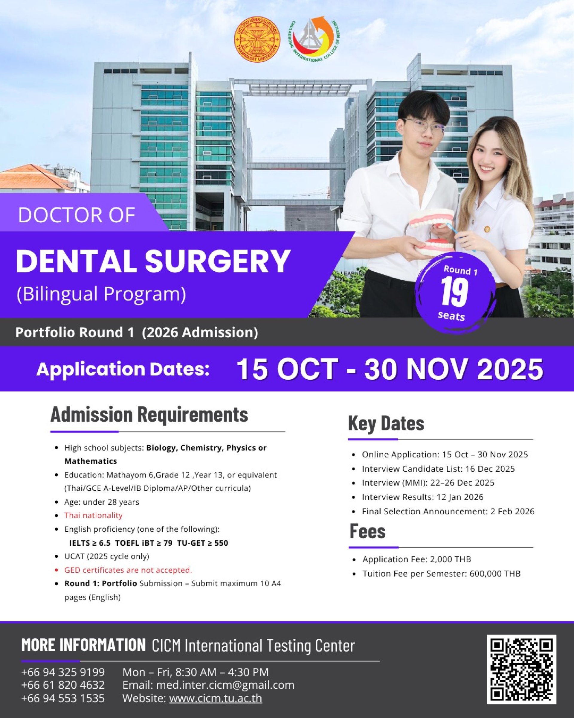 Chulabhorn International College of Medicine,Thammasat University is now accepting applications from new students to the Doctor of Dental Surgery (Bilingual Program) for the academic year 2026