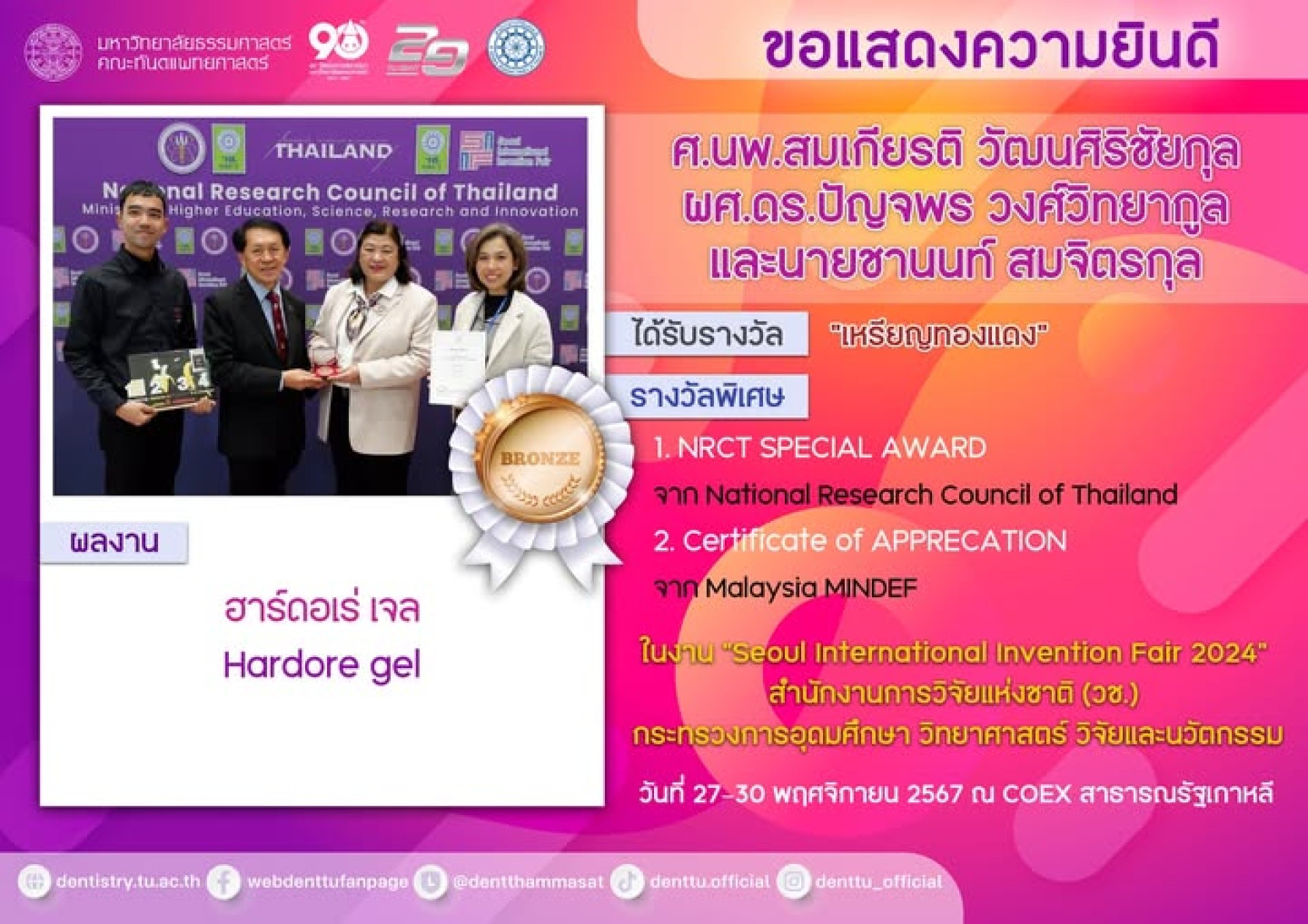 ศ.นพ.สมเกียรติ วัฒนศิริชัยกุล ผศ.ดร.ปัญจพร วงศ์วิทยากูล และนายชานนท์ สมจิตรกุล ได้รับรางวัล เหรียญทองแดง และรางวัลพิเศษ "NRCT SPECIAL AWARD จาก National Research Council of Thailand และ Certificate of APPRECATION จาก Malaysia MINDEF" ผลงาน "ฮาร์ดอเร่ เจล (Hardore gel)" ในงาน Seoul International Invention Fair 2024 สำนักงานการวิจัยแห่งชาติ (วช.) กระทรวงการอุดมศึกษา วิทยาศาสตร์ วิจัยและนวัตกรรม วันที่ 2730 พฤศจิกายน 2567 ณ COEX สาธารณรัฐเกาหลี