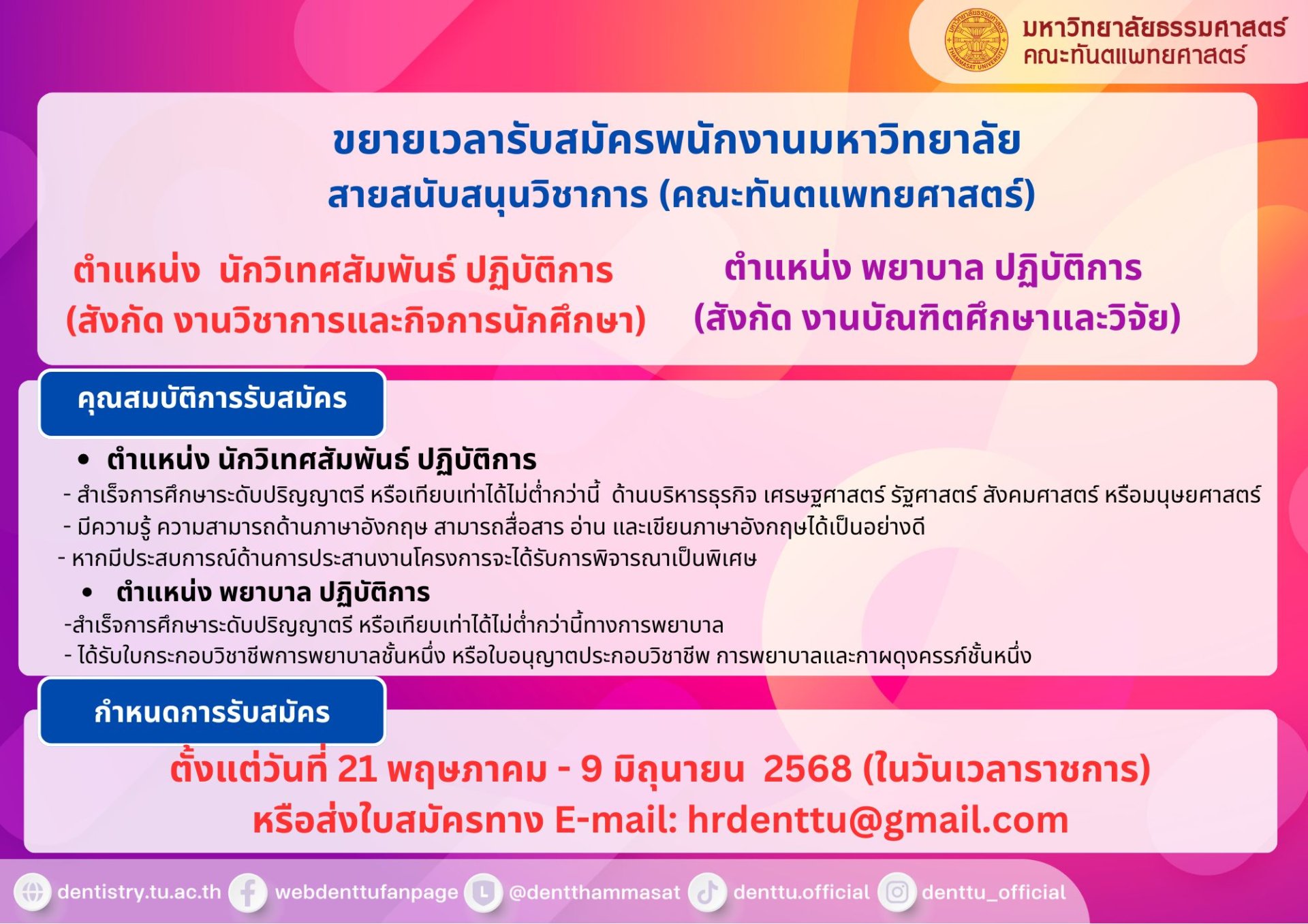 กำหนดการรับสมัคร : ตั้งแต่วันที่ 21 เมษายน - 20 พฤษภาคม 2568 (ในวันเวลาราชการ) หรือส่งใบสมัครทาง E-mail: hrdenttu@gmail.com