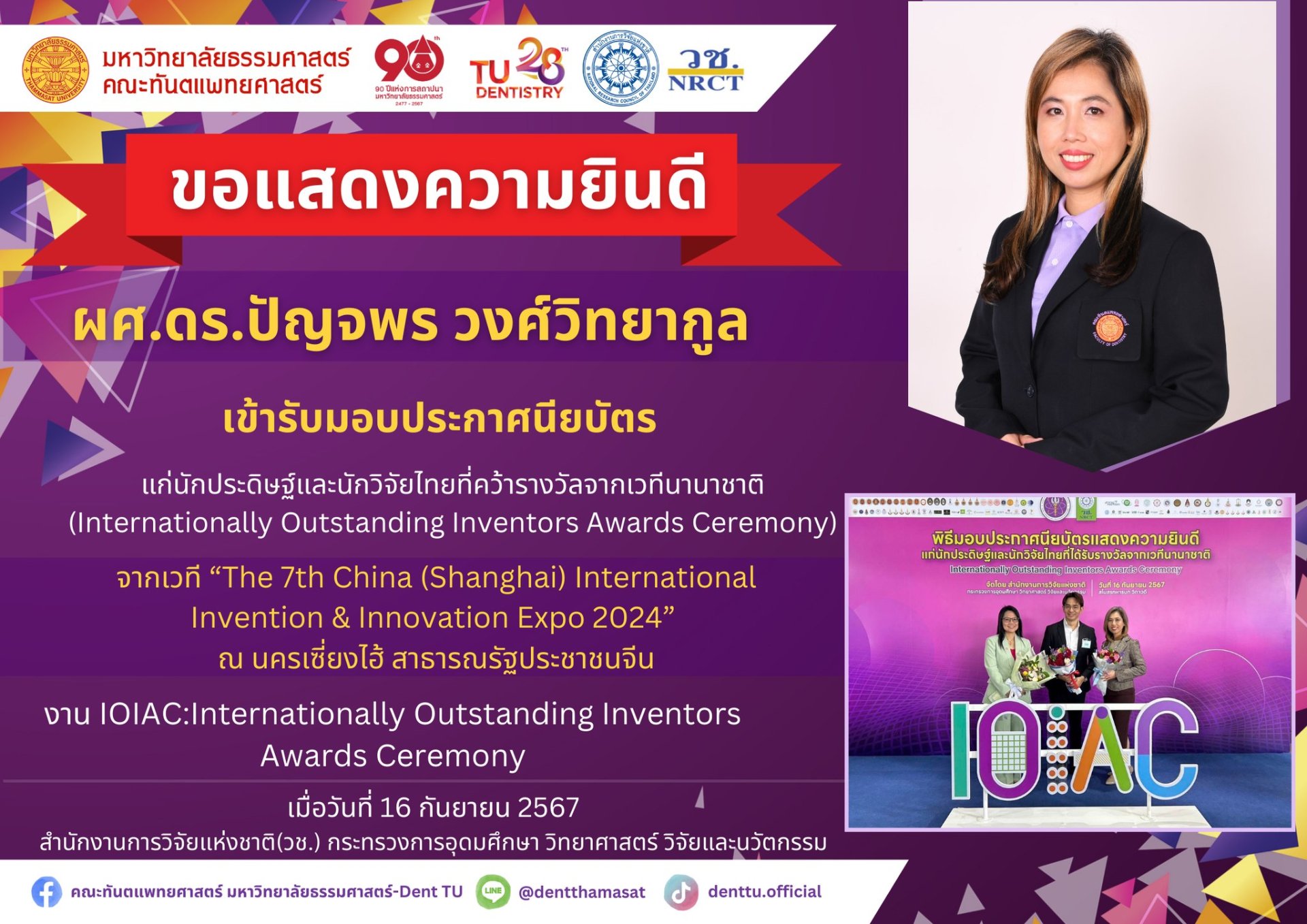 ขอแสดงความยินดี ผศ.ดร.ปัญจพร วงศ์วิทยากูล ที่เข้ารับมอบประกาศนียบัตรแก่นักประดิษฐ์และนักวิจัยไทยที่คว้ารางวัลจากเวทีนานาชาติ (Internationally Outstanding Inventors Awards Ceremony) จากเวที The 7th China (Shanghai) International Invention & Innovation Expo 2024 ณ นครเซี่ยงไฮ้ สาธารณรัฐประชาชนจีน ในงาน IOIAC:Internationally Outstanding Inventors Awards Ceremony เมื่อวันที่ 16 กันยายน 2567