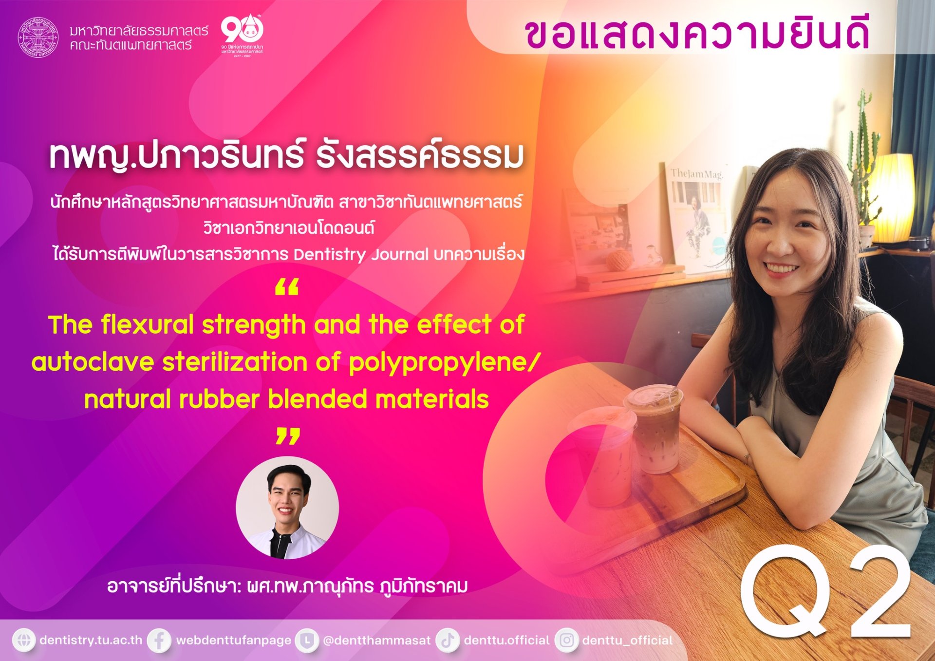 ทพญ.ปภาวรินทร์ รังสรรค์ธรรม นักศึกษาหลักสูตรวิทยาศาสตรมหาบัณฑิต สาขาวิชาทันตแพทยศาสตร์ วิชาเอกวิทยาเอนโดดอนต์ ได้รับการตีพิมพ์ในวารสารวิชาการ Dentistry Journal (Q2) บทความเรื่อง The flexural strength and the effect ofautoclave sterilization of polypropylene/natural rubber blended materials อาจารย์ที่ปรึกษา: ผศ.ทพ.ภาณุภัทร ภูมิภัทราคม