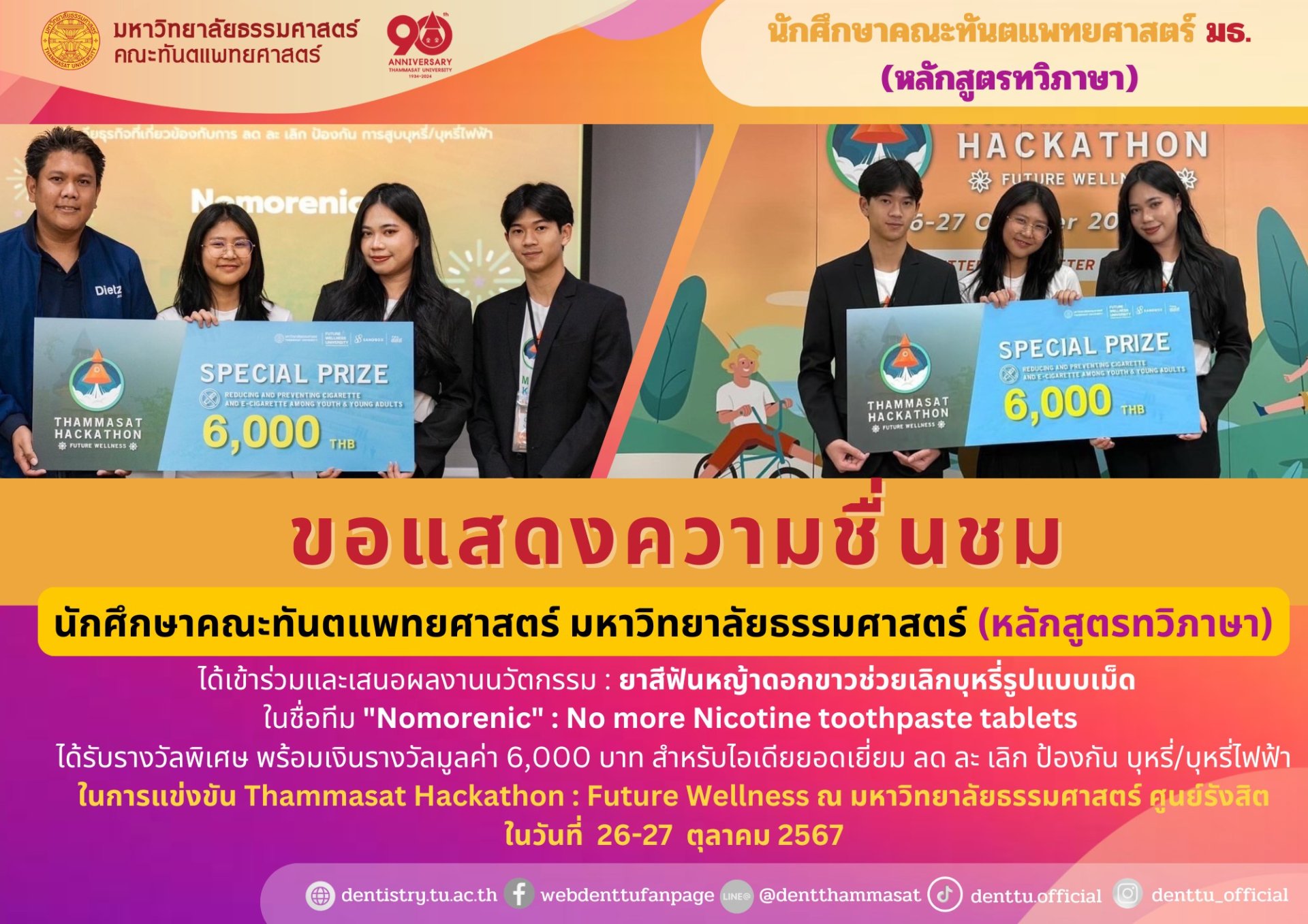 นักศึกษาคณะทันตแพทยศาสตร์ มหาวิทยาลัยธรรมศาสตร์ หลักสูตรทวิภาษา ได้เข้าร่วมและเสนอผลงานนวัตกรรม : ยาสีฟันหญ้าดอกขาวช่วยเลิกบุหรี่รูปแบบเม็ด ในชื่อทีม "Nomorenic" : No more Nicotine toothpaste tablets ได้รับรางวัลพิเศษ พร้อมเงินรางวัลมูลค่า 6,000 บาท สำหรับไอเดียยอดเยี่ยม ลด ละ เลิก ป้องกัน บุหรี่/บุหรี่ไฟฟ้า ในการแข่งขัน Thammasat Hackathon : Future Wellness ณ มหาวิทยาลัยธรรมศาสตร์ ศูนย์รังสิต ในวันที่ 26-27 ตุลาคม 2567