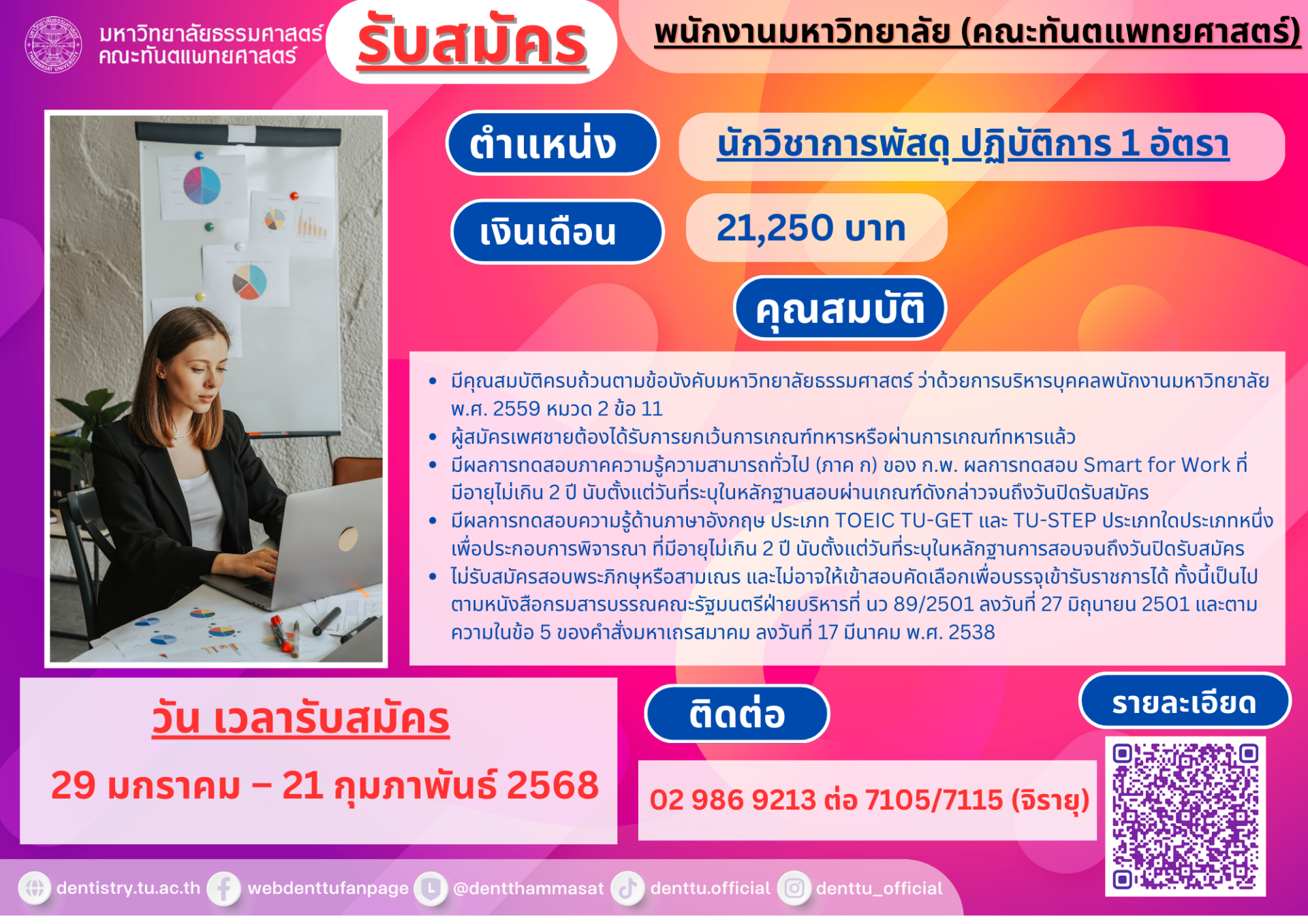 เปิดรับสมัครตั้งวันที่ 29 มกราคม - 21 กุมภาพันธ์ 2568 ในวันและเวลาราชการ หรือส่งใบสมัครทาง E-mail: hrdenttu@gmail.com