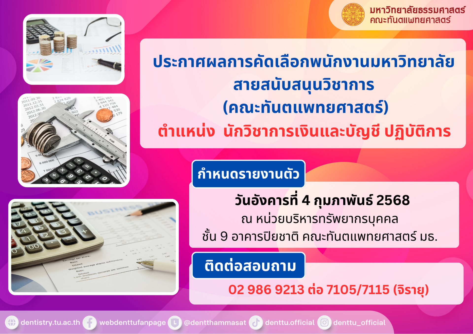 กำหนดรายงานตัว : วันอังคารที่ 4 กุมภาพันธ์ 2568 ณ หน่วยบริหารทรัพยากรบุคคล ชั้น 9 อาคารปิยชาติ คณะทันตแพทยศาสตร์ มธ.
