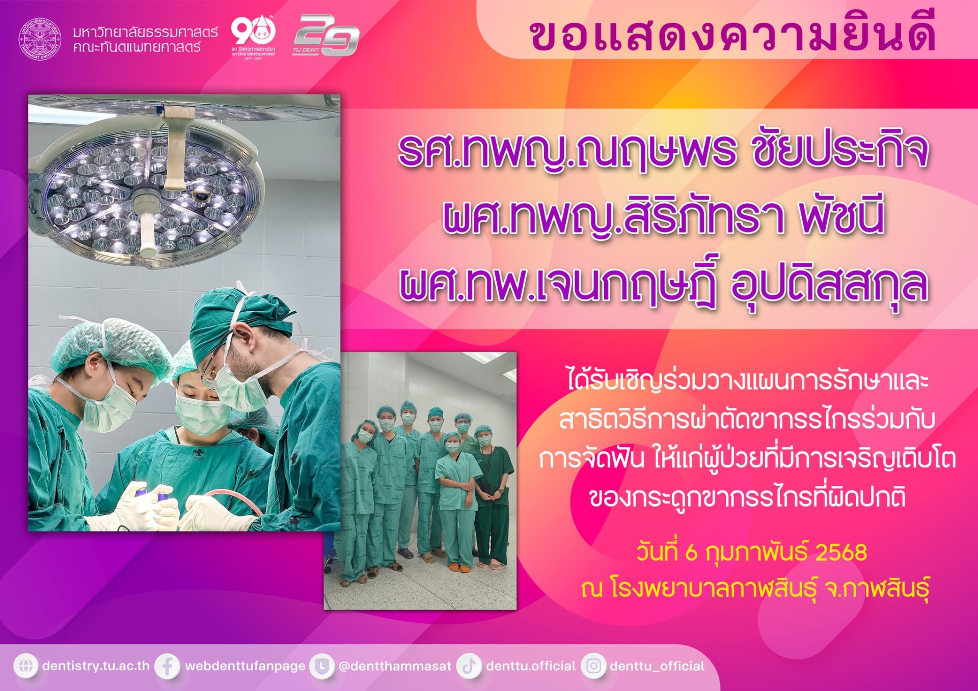 รศ.ทพญ.ณฤษพร ชัยประกิจ ผศ.ทพญ.สิริภัทรา พัชนี และผศ.ทพ.เจนกฤษฎิ์ อุปดิสสกุล ได้รับเชิญจากแผนกทันตกรรมโรงพยาบาลกาฬสินธุ์ เพื่อร่วมวางแผนการรักษา และสาธิตวิธีการผ่าตัดขากรรไกรร่วมกับการจัดฟัน ให้แก่ผู้ป่วยที่มีการเจริญเติบโตของกระดูกขากรรไกรที่ผิดปกติ เมื่อวันที่ 6 กุมภาพันธ์ 2568 ณ โรงพยาบาลกาฬสินธุ์ จ.กาฬสินธุ์