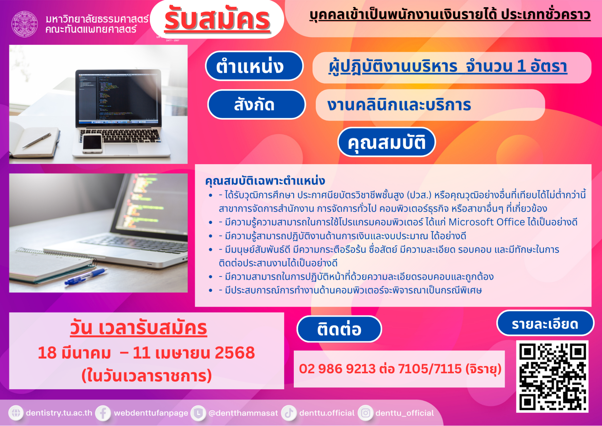วัน เวลารับสมัคร : วันที่ 18 มีนาคม 11 เมษายน 2568 (ในวันเวลาราชการ)
