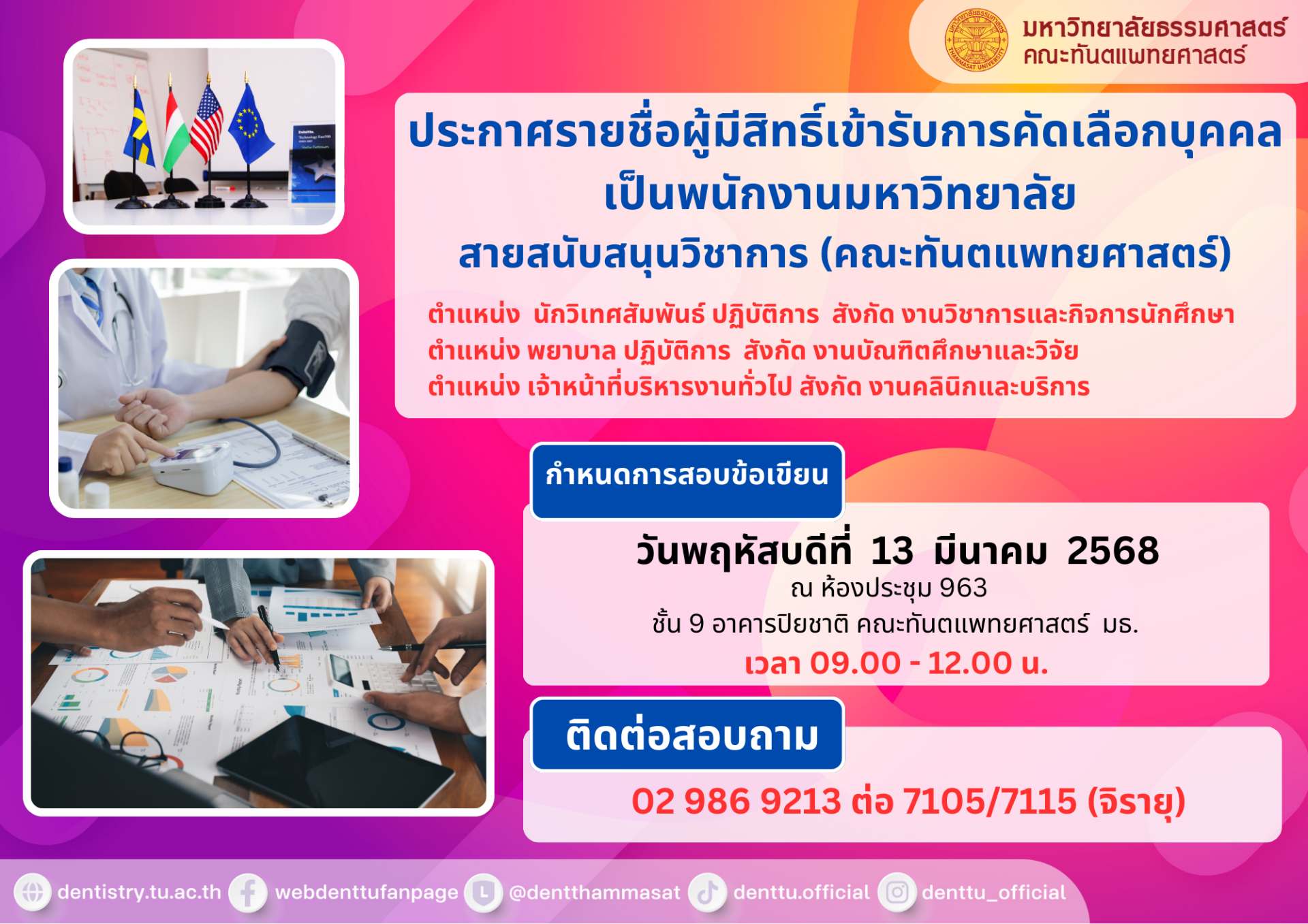 กำหนดการสอบข้อเขียน : วันพฤหัสบดีที่ 13 มีนาคม 2568 ณ ห้องประชุม 963 ชั้น 9 อาคารปิยชาติ คณะทันตแพทยศาสตร์ มธ. (เวลา 09.00 - 12.00 น.)