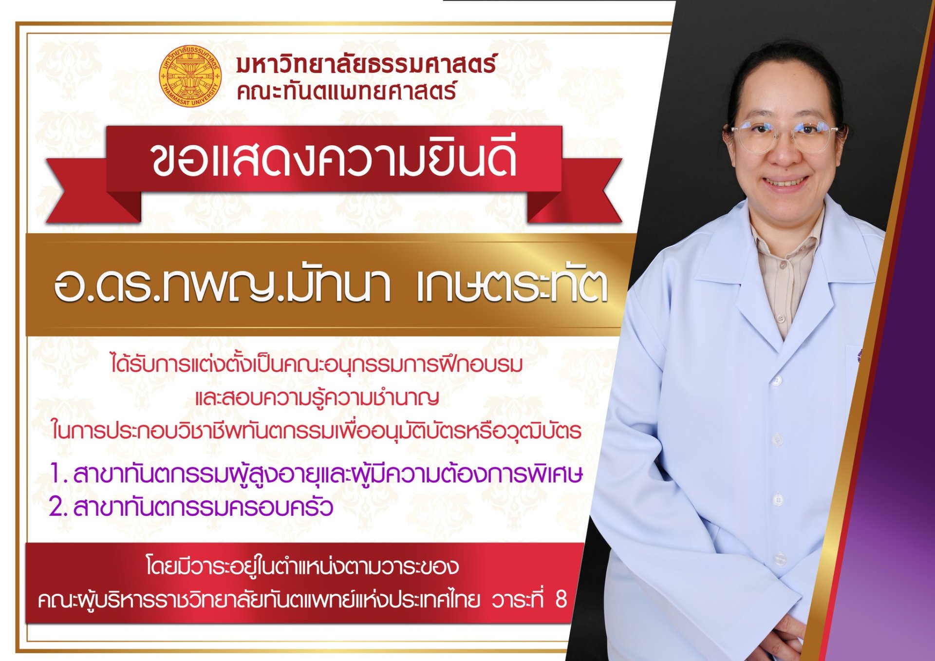 อ.ดร.ทพญ.มัทนา เกษตระทัต ได้รับการแต่งตั้งเป็นคณะอนุกรรมการฝึกอบรมและสอบความรู้ความชํานาญในการประกอบวิชาชีพทันตกรรมเพื่ออนุมัติบัตรหรือวุฒิบัตร "สาขาทันตกรรมผู้สูงอายุและผู้มีความต้องการพิเศษ" และ "สาขาทันตกรรมครอบครัว"