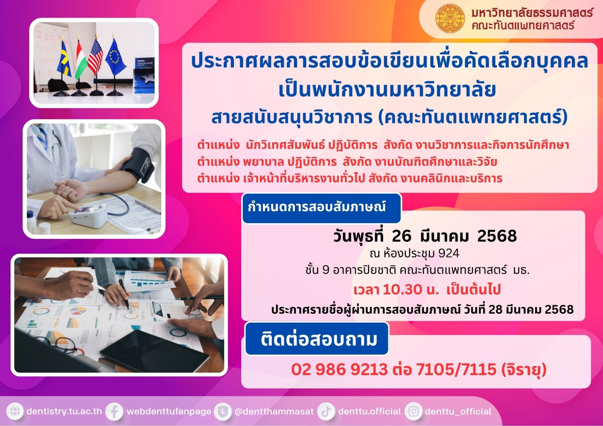 กำหนดการสอบสัมภาษณ์ : วันพุธที่ 26 มีนาคม 2568 ณ ห้องประชุม 924 ชั้น 9 อาคารปิยชาติ คณะทันตแพทยศาสตร์ มธ. เวลา 10.30 น. เป็นต้นไป