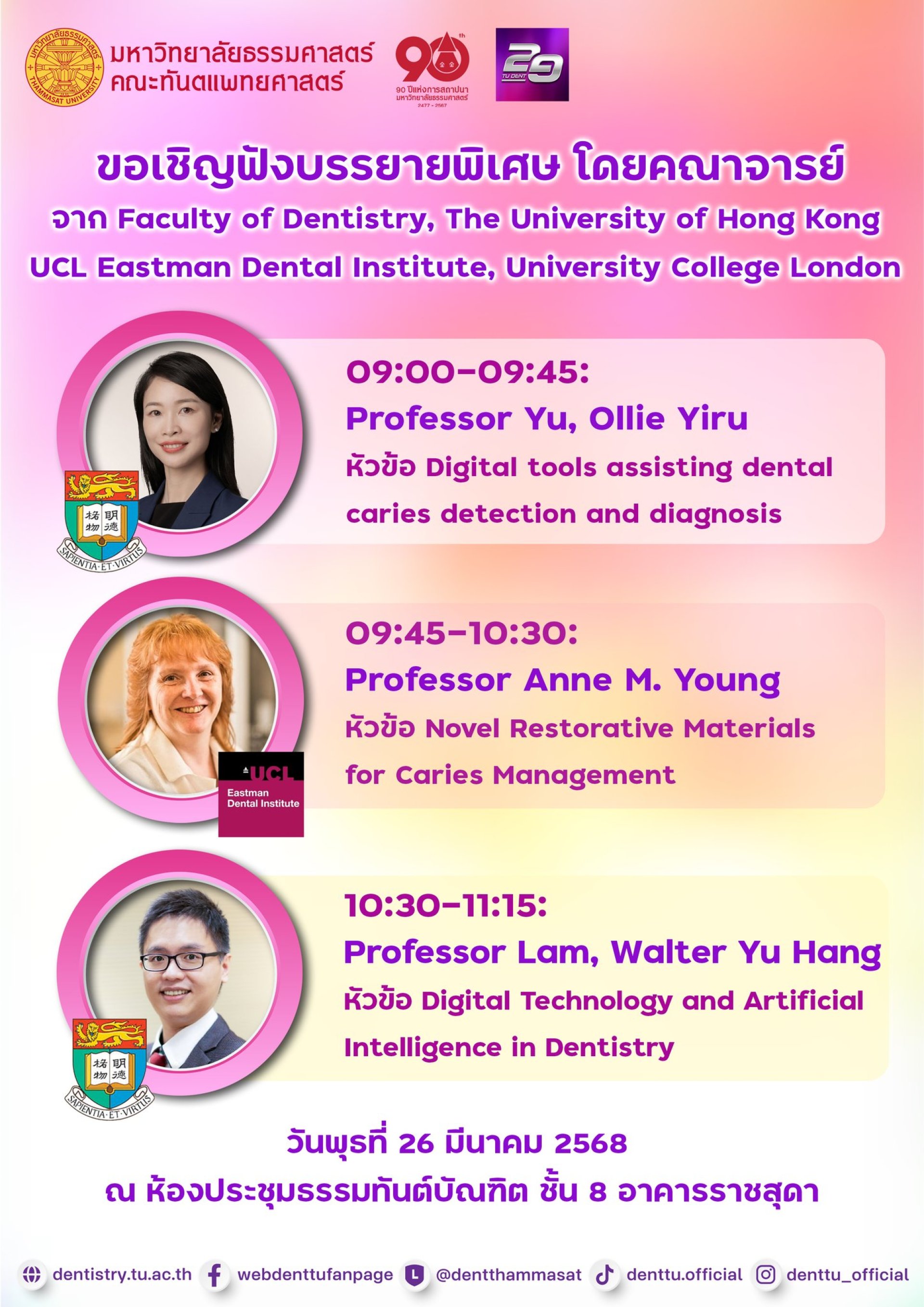 ขอเชิญฟังบรรยายพิเศษโดยคณาจารย์จาก Faculty of Dentistry, The University of Hong Kong UCL Eastman Dental Institute, University College London