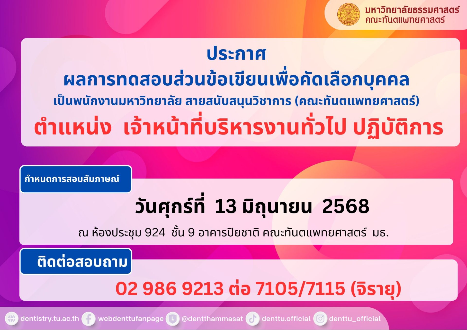 กำหนดการสอบสัมภาษณ์ : วันศุกร์ที่ 13 มิถุนายน 2568 ณ ห้องประชุม 924 ชั้น 9 อาคารปิยชาติ คณะทันตแพทยศาสตร์ มธ.