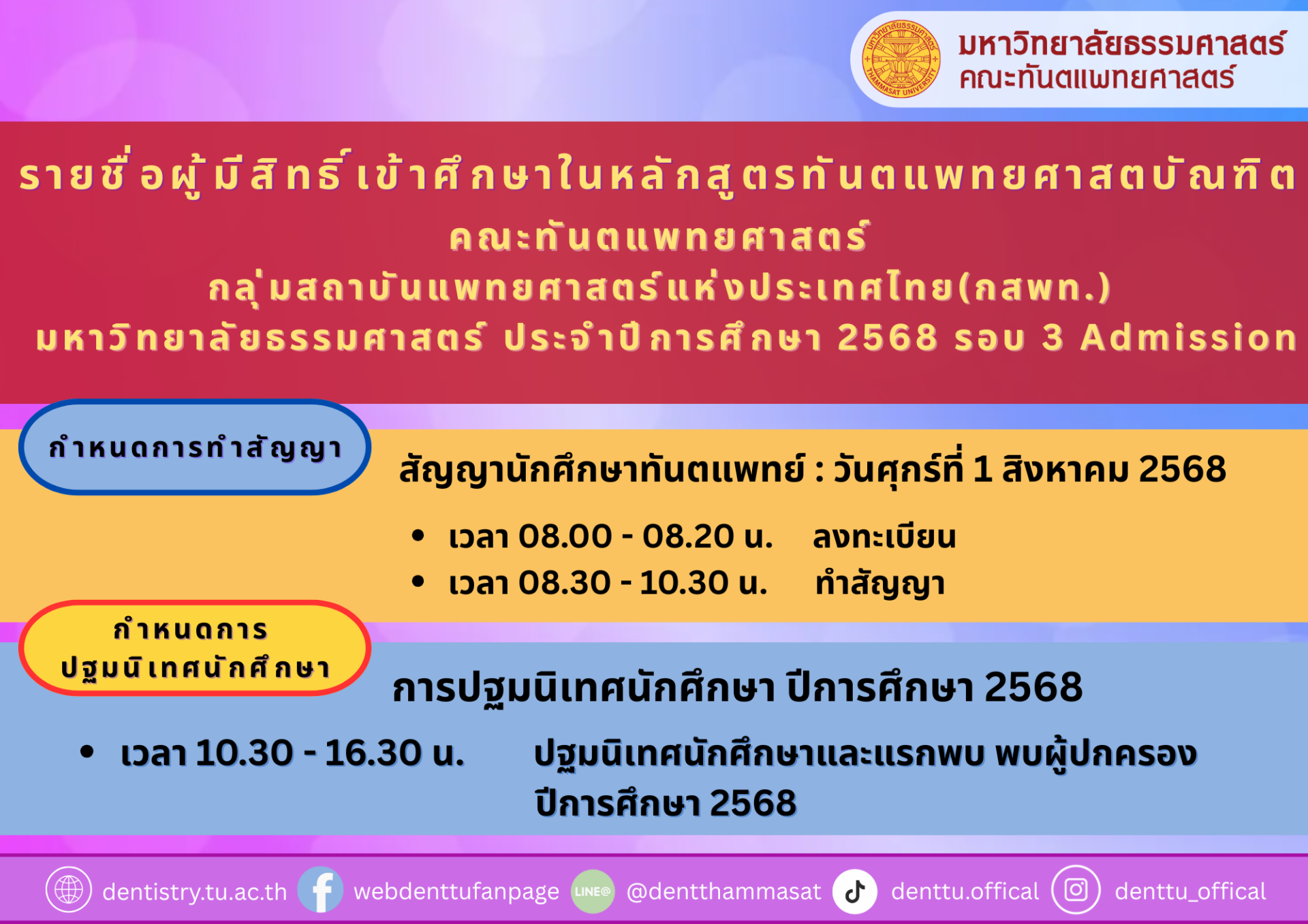 กำหนดการทำสัญญา >> สัญญานักศึกษาทันตแพทย์ : วันศุกร์ที่ 1 สิงหาคม 2568