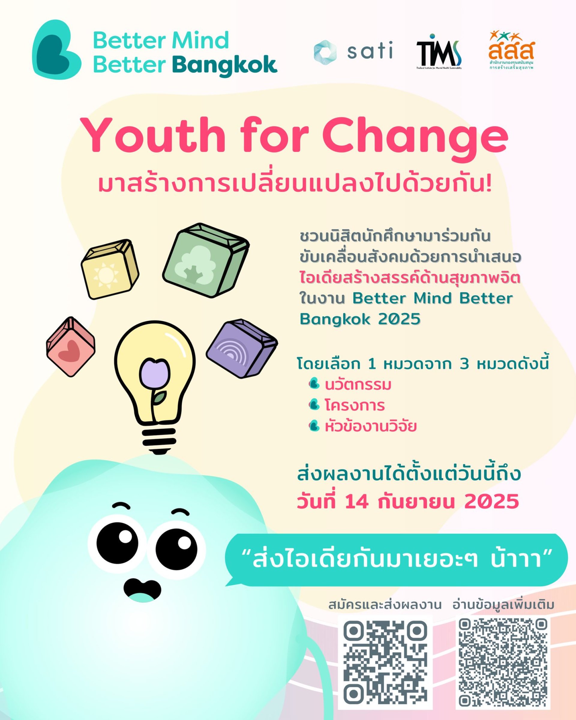 มาร่วมเป็นส่วนหนึ่งในงาน Better Mind Better Bangkok 2025 เวทีที่เปิดโอกาสให้นิสิตนักศึกษาระดับปริญญาตรีได้ระเบิดความคิดสร้างสรรค์ เพื่อสร้างการเปลี่ยนแปลงให้กับสังคมในเรื่องสุขภาพจิตไปพร้อมกัน