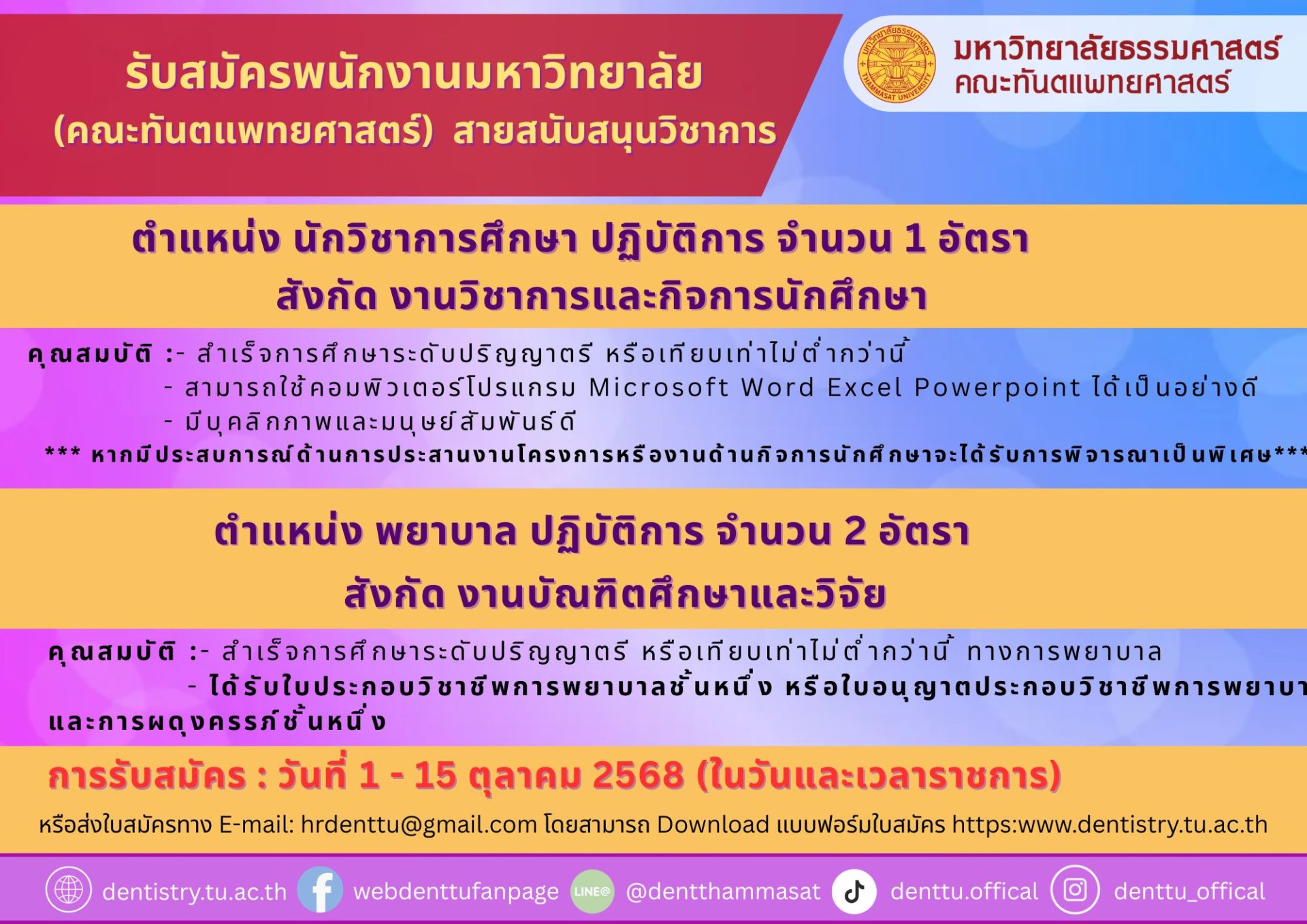 การรับสมัคร : วันที่ 1 - 15 ตุลาคม 2568 (ในวันและเวลาราชการ) หรือส่งใบสมัครทาง E-mail: hrdenttu@gmail.com โดยสามารถ Download แบบฟอร์มใบสมัคร https:www.dentistry.tu.ac.th