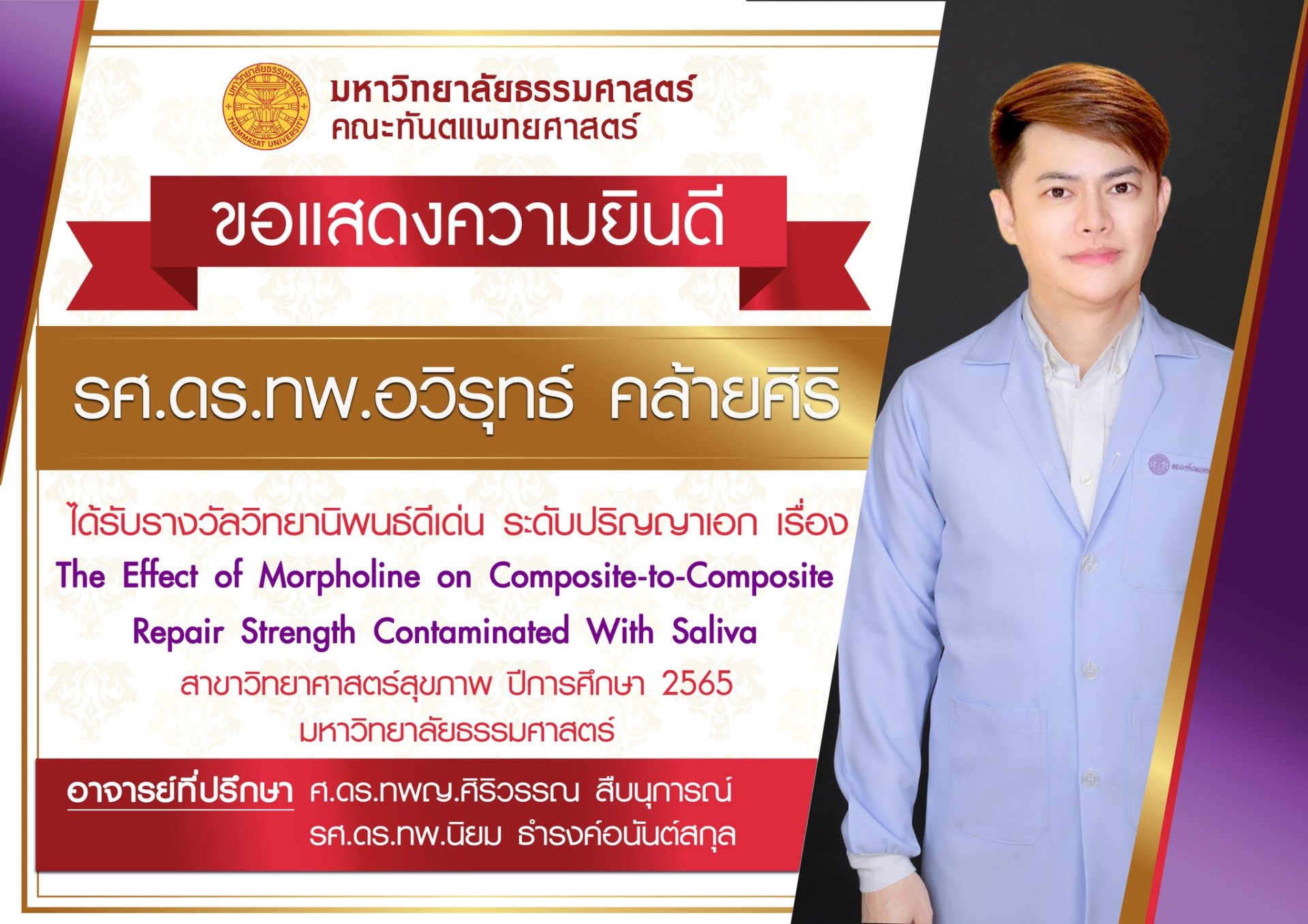 รศ.ดร.ทพ.อวิรุทธ์ คล้ายศิริ ได้รับรางวัลวิทยานิพนธ์ดีเด่น ระดับปริญญาเอก เรื่อง the Effect of Morpholine on Composite-to-Composite Repair Strength Contaminated With Saliva สาขาวิทยาศาสตร์สุขภาพ ปีการศึกษา 2565 มหาวิทยาลัยธรรมศาสตร์ อาจารย์ที่ปรึกษาโดย ศ.ดร.ทพญ.ศิริวรรณ สืบนุการณ์ และ รศ.ดร.ทพ.นิยม ธำรงค์อนันต์สกุล