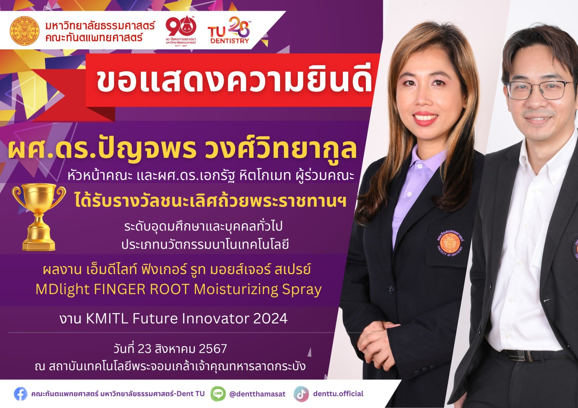 ผศ.ดร.ปัญจพร วงศ์วิทยากูล หัวหน้าคณะ และผศ.ดร.เอกรัฐ หิตโกเมท ผู้ร่วมคณะ ได้รับรางวัลชนะเลิศถ้วยพระราชทานฯ ระดับอุดมศึกษาและบุคคลทั่วไป ประเภทนวัตกรรมนาโนเทคโนโลยี จากผลงาน "เอ็มดีไลท์ ฟิงเกอร์ รูท มอยส์เจอร์ สเปรย์ MDlight FINGER ROOT Moisturizing Spray" งาน KMITL Future Innovator 2024 วันที่ 23 สิงหาคม 2567 ณ สถาบันเทคโนโลยีพระจอมเกล้าเจ้าคุณทหารลาดกระบัง กรุงเทพมหานคร