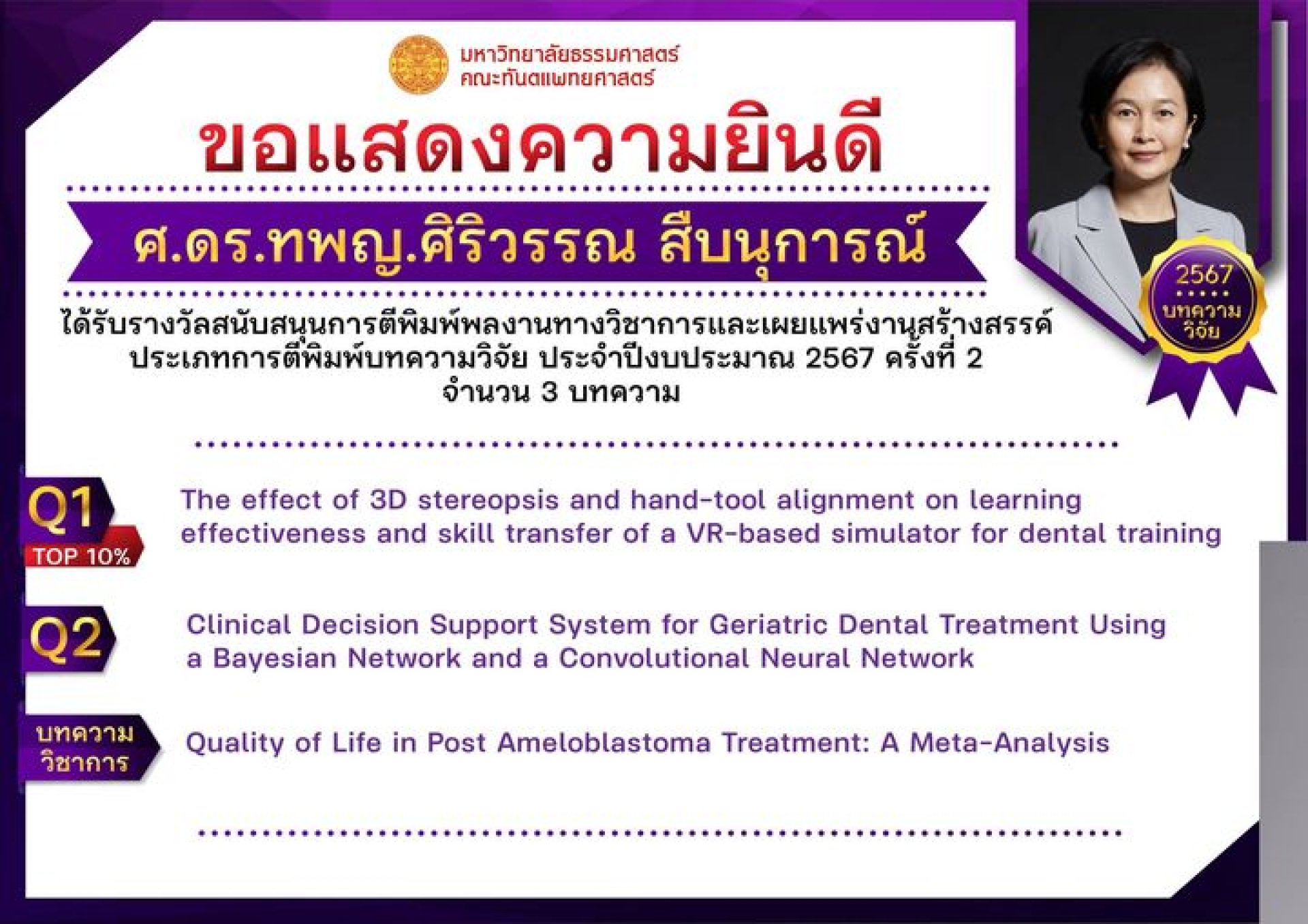 ศ.ดร.ทพญ.ศิริวรรณ สืบนุการณ์ ได้รับรางวัลสนับสนุนการตีพิมพ์พลงานทางวิชาการและเผยแพร่งานสร้างสรรค์ ประเภทการตีพิมพ์บทความวิจัย ประจำปีงบประมาณ 2567 ครั้งที่ 2 จำนวน 3 บทความ ดังนี้