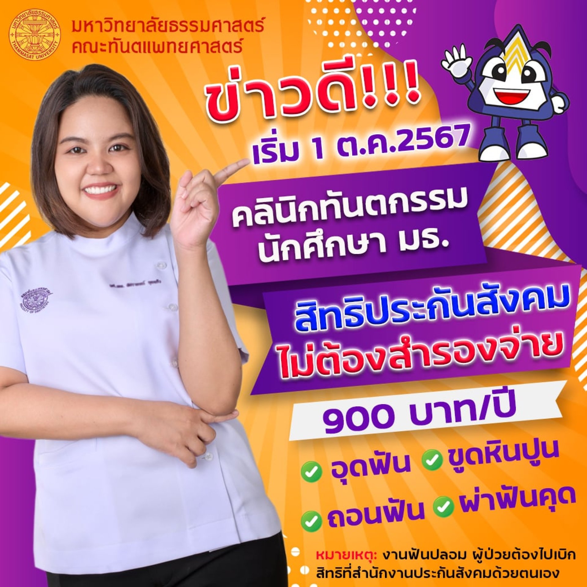 - สามารถใช้บริการรักษาทางทันตกรรมที่คลินิกทันตกรรมนักศึกษา คณะทันตแพทยศาสตร์ มหาวิทยาลัยธรรมศาสตร์ ไม่ต้องสำรองจ่าย 900 บาท/ปี