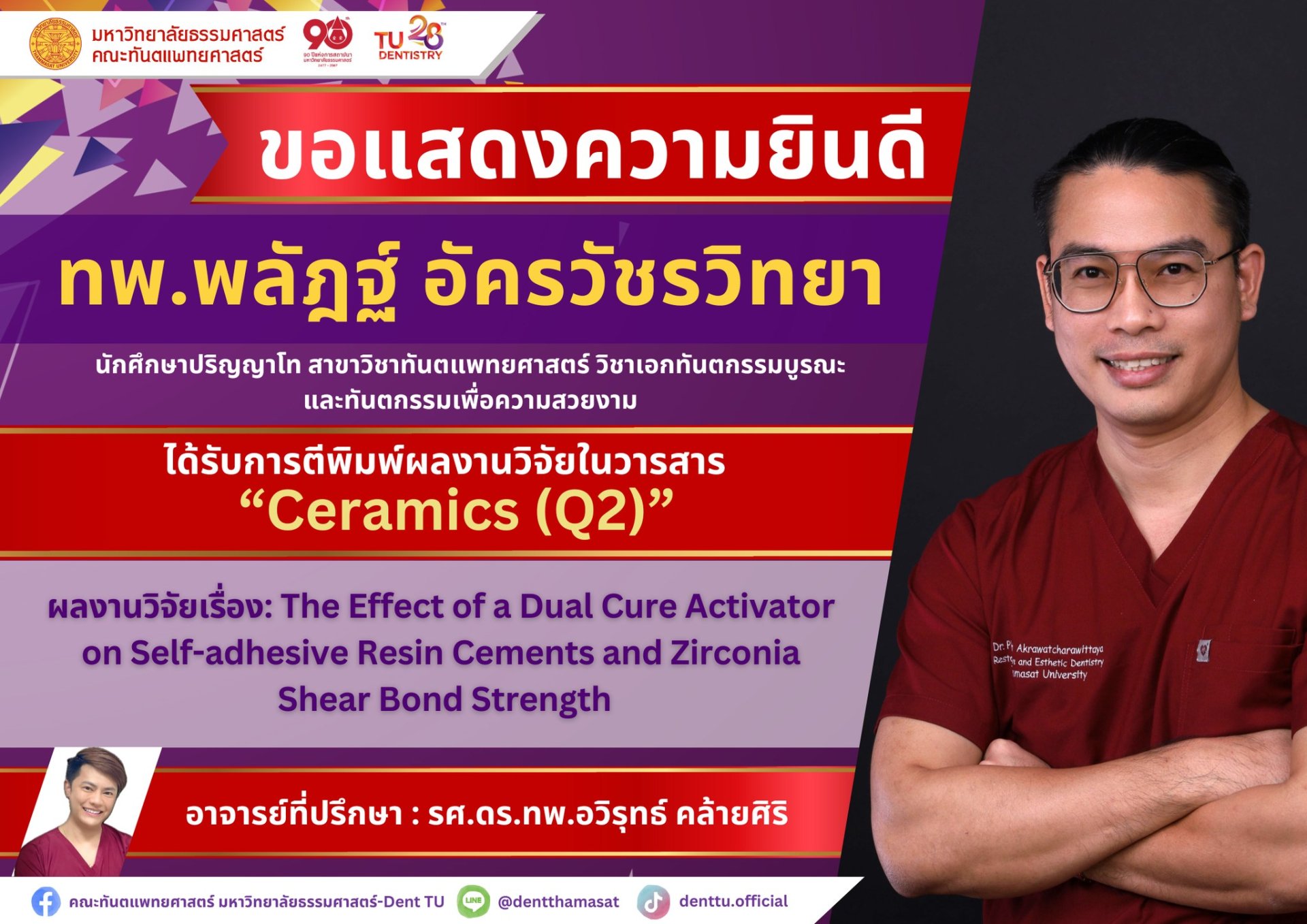 ทพ.พลัฎฐ์ อัครวัชรวิทยา นักศึกษาปริญญาโท สาขาวิชาทันตแพทยศาสตร์ วิชาเอกทันตกรรมบูรณะและทันตกรรมเพื่อความสวยงาม ได้รับการตีพิมพ์ผลงานวิจัยในวารสาร Ceramics (Q2) ผลงานวิจัยเรื่อง: The Effect of a Dual Cure Activator on Self-adhesive Resin Cements and Zirconia