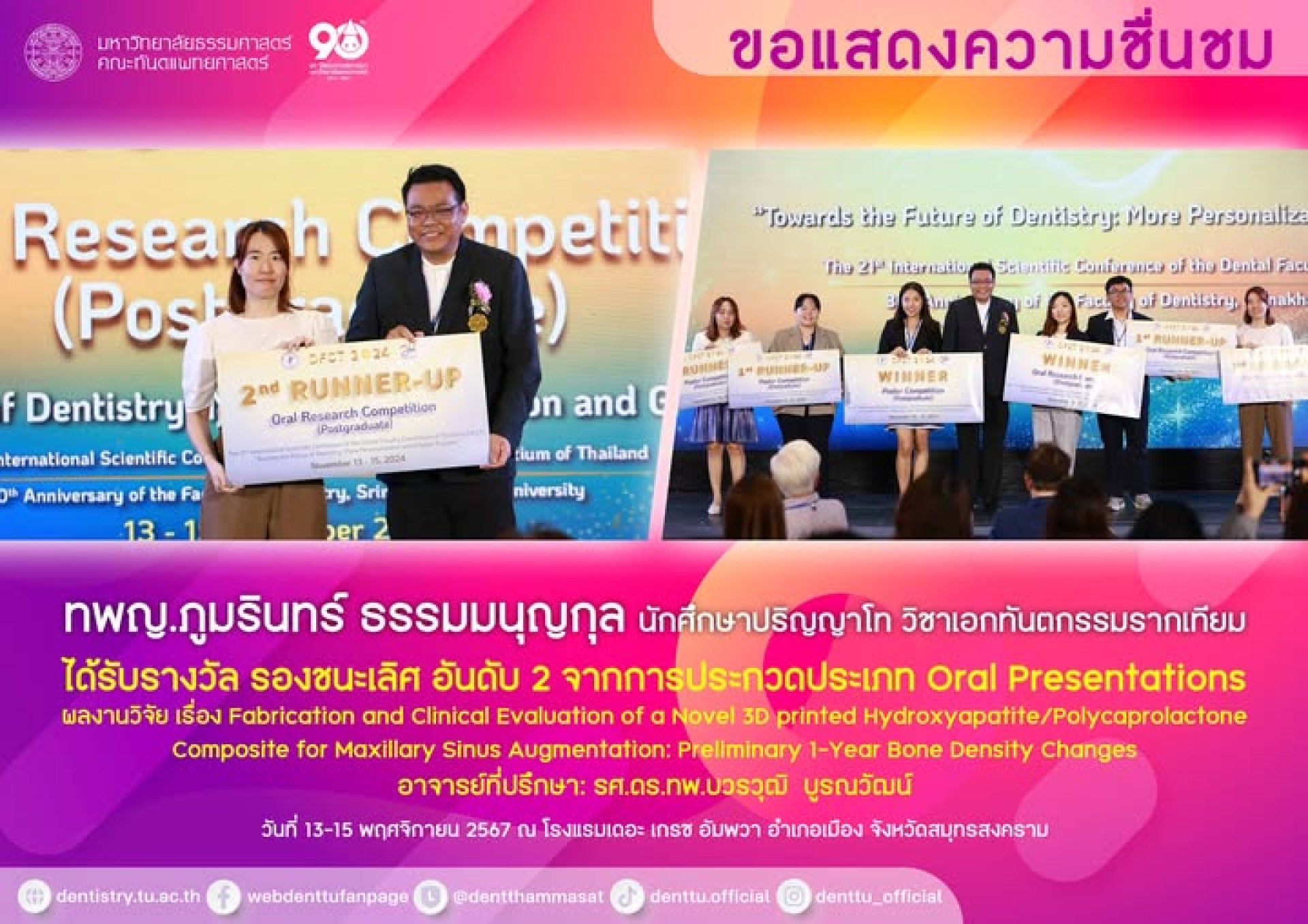 ทพญ.ภูมรินทร์ ธรรมมนุญกุล (นักศึกษาปริญญาโท สาขาทันตกรรมรากเทียม) ได้รางวัล "รองชนะเลิศ อันดับ 2" จากการประกวดประเภท Oral Presentations ผลงานวิจัย เรื่อง Fabrication and Clinical Evaluation of a Novel 3D printed Hydroxyapatite/Polycaprolactone Composite for Maxillary Sinus Augmentation: Preliminary 1-Year Bone Density Changes อาจารย์ที่ปรึกษา: รศ.ดร.ทพ.บวรวุฒิ บูรณวัฒน์ จากการประกวดผลงานวิจัย สาขาทันตแพทยศาสตร์ ระดับนานาชาติ ครั้งที่ 21 องค์กรผู้บริหารคณะทันตแพทยศาสตร์แห่งประเทศไทย (อ.บ.ท.ท.) และเนื่องในโอกาสครบรอบ 30 ปี คณะทันตแพทยศาสตร์ มหาวิทยาลัยศรีนครินทรวิโรฒ ระหว่างที่ 13-15 พฤศจิกายน 2567 ณ โรงแรมเดอะ เกรซ อัมพวา อำเภอเมือง จังหวัดสมุทรสงคราม