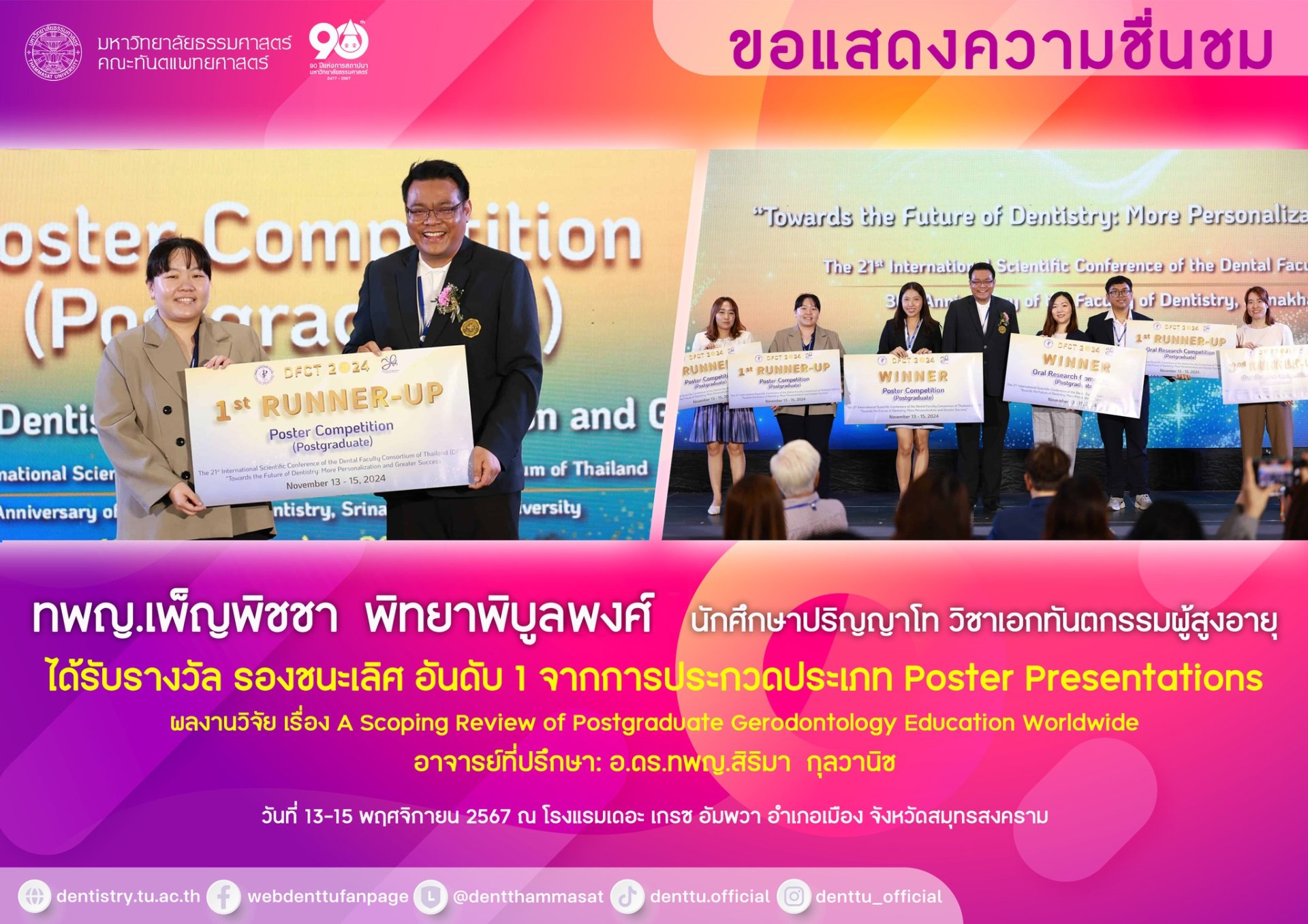 ทพญ.เพ็ญพิชชา พิทยาพิบูลพงศ์ (นักศึกษาปริญญาโท สาขาทันตกรรมผู้สูงอายุ) ได้รางวัล "รองชนะเลิศ อันดับ 1" จากการประกวดประเภท Poster Presentations ผลงานวิจัย เรื่อง A Scoping Review of Postgraduate Gerodontology Education Worldwide อาจารย์ที่ปรึกษา: อ.ดร.ทพญ. สิริมา กุลวานิช จากการประกวดผลงานวิจัย สาขาทันตแพทยศาสตร์ ระดับนานาชาติ ครั้งที่ 21 องค์กรผู้บริหารคณะทันตแพทยศาสตร์แห่งประเทศไทย (อ.บ.ท.ท.) และเนื่องในโอกาสครบรอบ 30 ปี คณะทันตแพทยศาสตร์ มหาวิทยาลัยศรีนครินทรวิโรฒ ระหว่างที่ 13-15 พฤศจิกายน 2567 ณ โรงแรมเดอะ เกรซ อัมพวา อำเภอเมือง จังหวัดสมุทรสงคราม