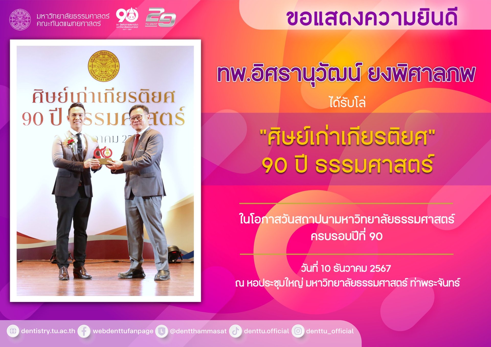 ทพ.อิศรานุวัฒน์ ยงพิศาลภพ ศิษย์เก่าคณะทันตแพทยศาสตร์ มหาวิทยาลัยธรรมศาสตร์ ได้รับโล่ ศิษย์เก่าเกียรติยศ ในโอกาสวันธรรมศาสตร์และวันสถาปนามหาวิทยาลัยธรรมศาสตร์ครบรอบปีที่ 90 วันที่ 10 ธันวาคม 2567 ณ หอประชุมใหญ่ มหาวิทยาลัยธรรมศาสตร์ ท่าพระจันทร์