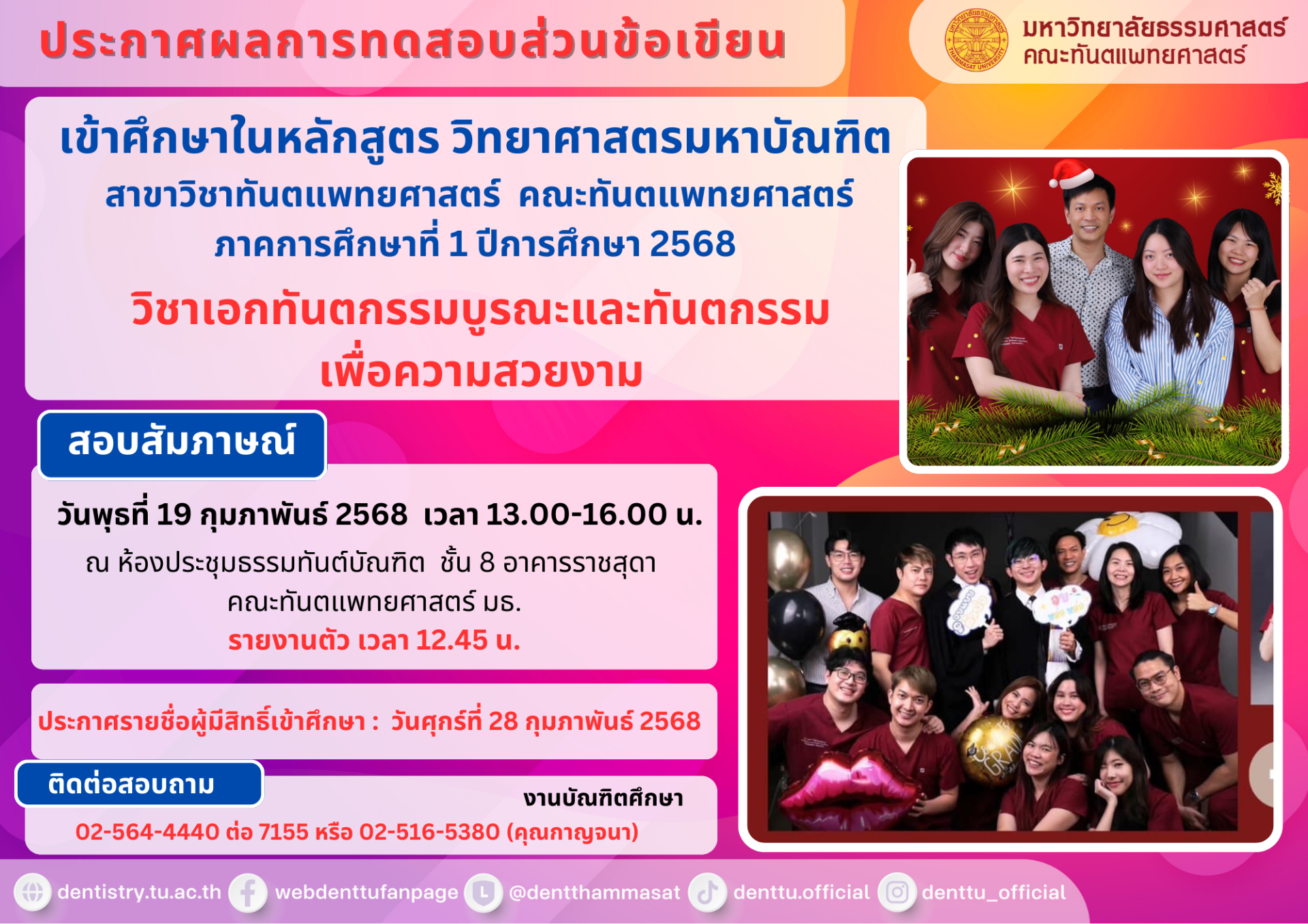 สอบสัมภาษณ์ : วันพุธที่ 19 กุมภาพันธ์ 2568 เวลา 13.00-16.00 น. ณ ห้องประชุมธรรมทันต์บัณฑิต ชั้น 8 อาคารราชสุดาคณะทันตแพทยศาสตร์ มธ. (รายงานตัว เวลา 12.45 น.)