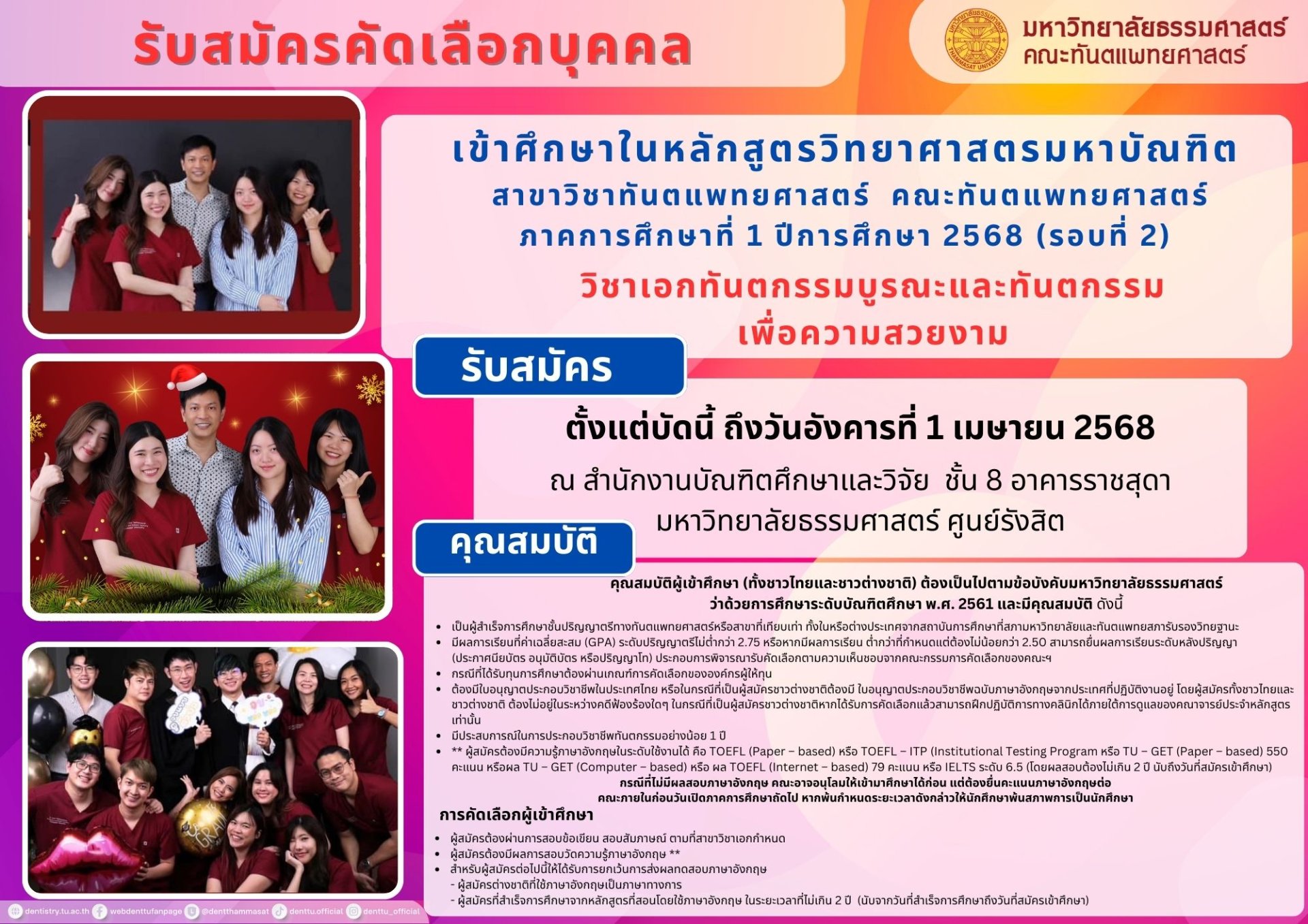 การรับสมัคร : ตั้งแต่บัดนี้ ถึงวันอังคารที่ 1 เมษายน 2568 ณ สำนักงานบัณฑิตศึกษาและวิจัย ชั้น 8 อาคารราชสุดา มหาวิทยาลัยธรรมศาสตร์ ศูนย์รังสิต