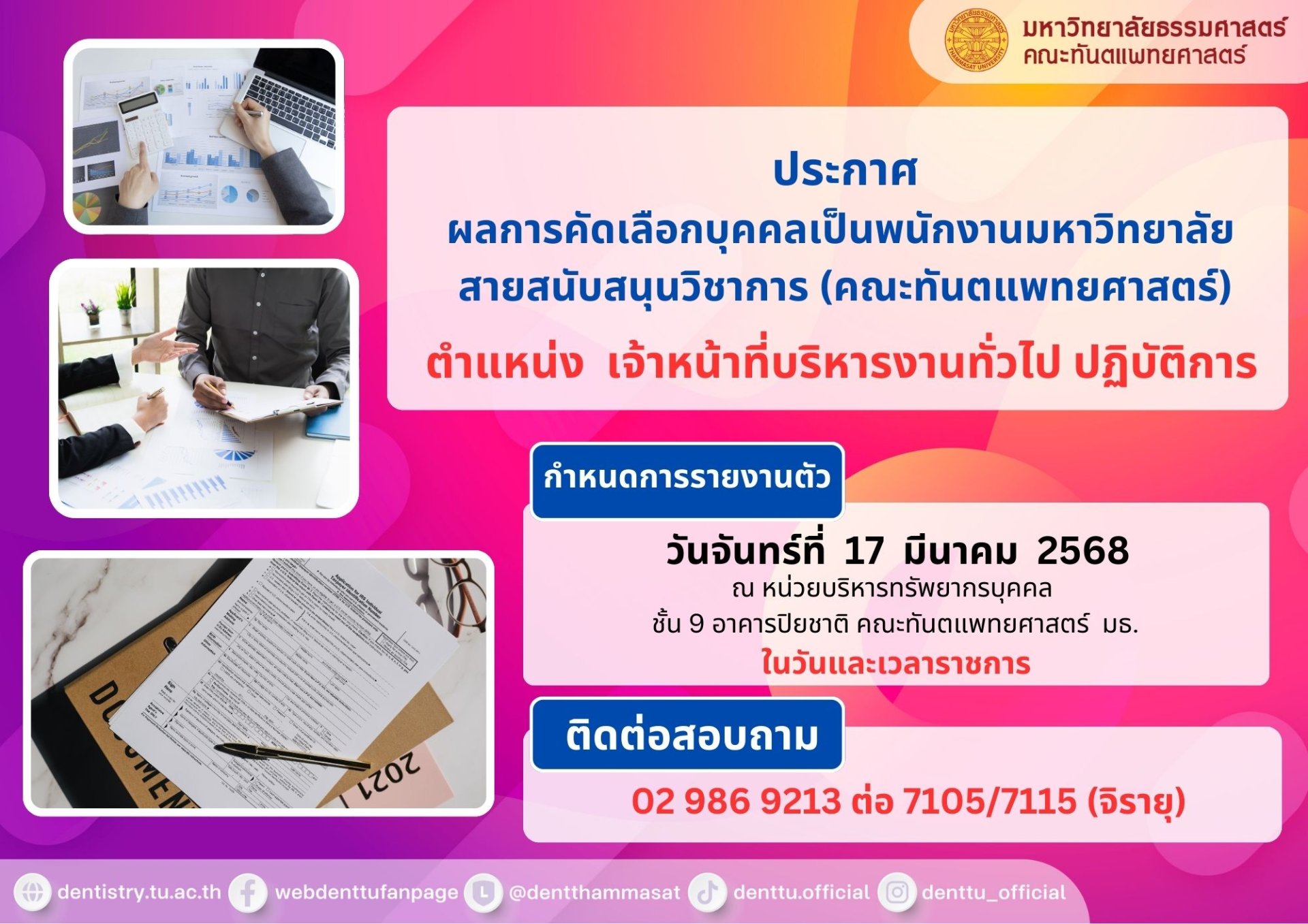 กำหนดการรายงานตัว : วันจันทร์ที่ 17 มีนาคม 2568 ณ หน่วยบริหารทรัพยากรบุคคล ชั้น 9 อาคารปิยชาติ คณะทันตแพทยศาสตร์ มธ. (ในวันและเวลาราชการ)