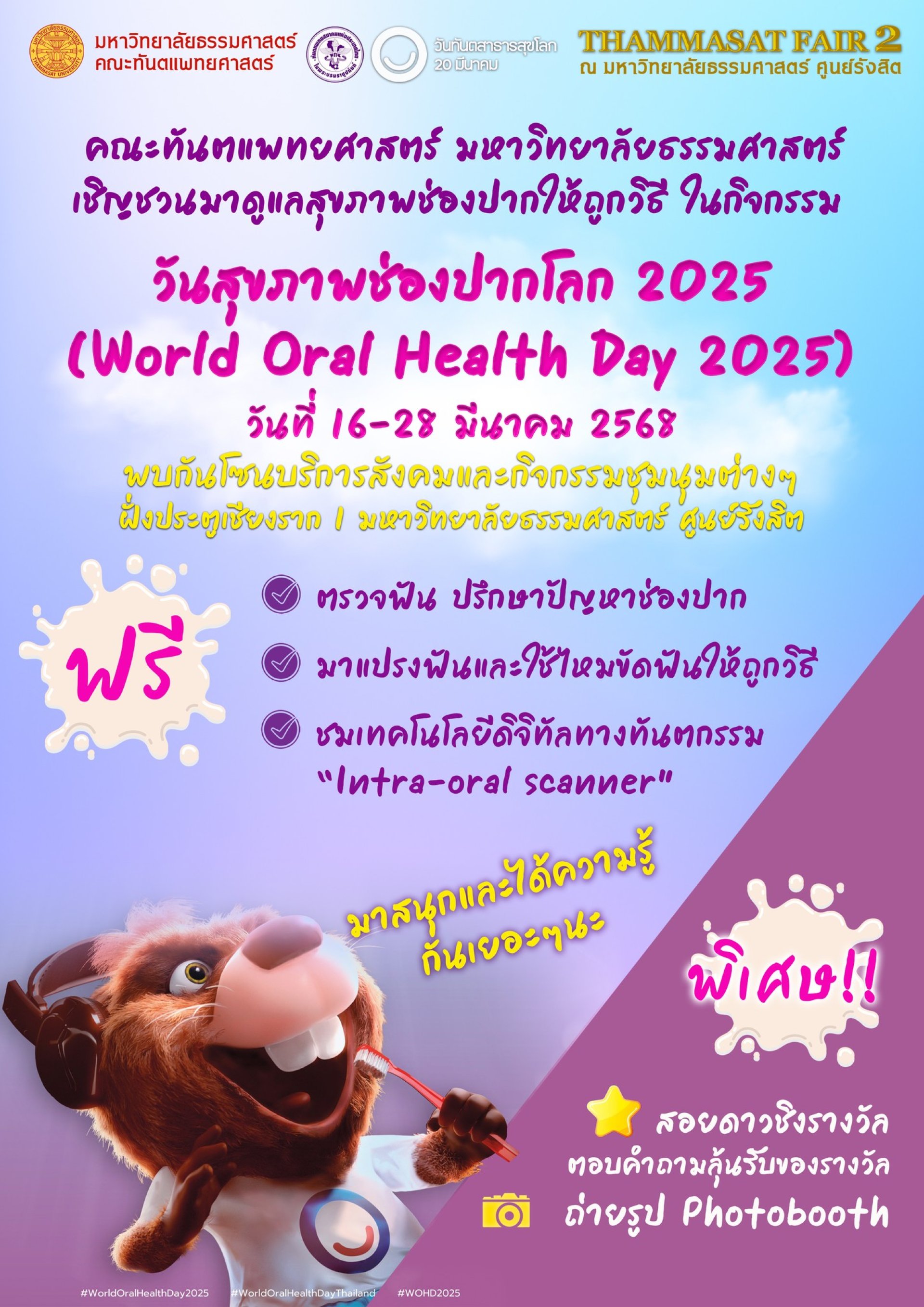 ธรรมศาสตร์ แฟร์ 2025 ปีนี้ไม่ได้มีแต่ร้านอร่อย เจ้าดัง แต่ยังมีคณะทันตแพทยศาสตร์ ที่จะเชิญชวนทุกท่านมาร่วมสนุกและได้ความรู้ เนื่องในวันสุขภาพช่องปากโลก 2025