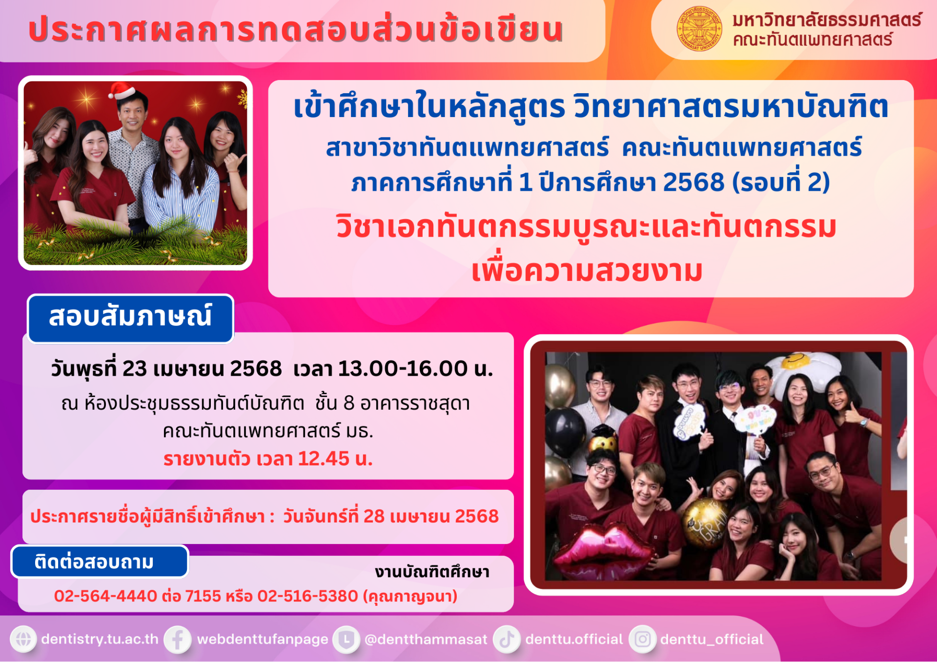 สอบสัมภาษณ์ : วันพุธที่ 23 เมษายน 2568 เวลา 13.00-16.00 น. ณ ห้องประชุมธรรมทันต์บัณฑิต ชั้น 8 อาคารราชสุดา คณะทันตแพทยศาสตร์ มธ. (รายงานตัว เวลา 12.45 น.)