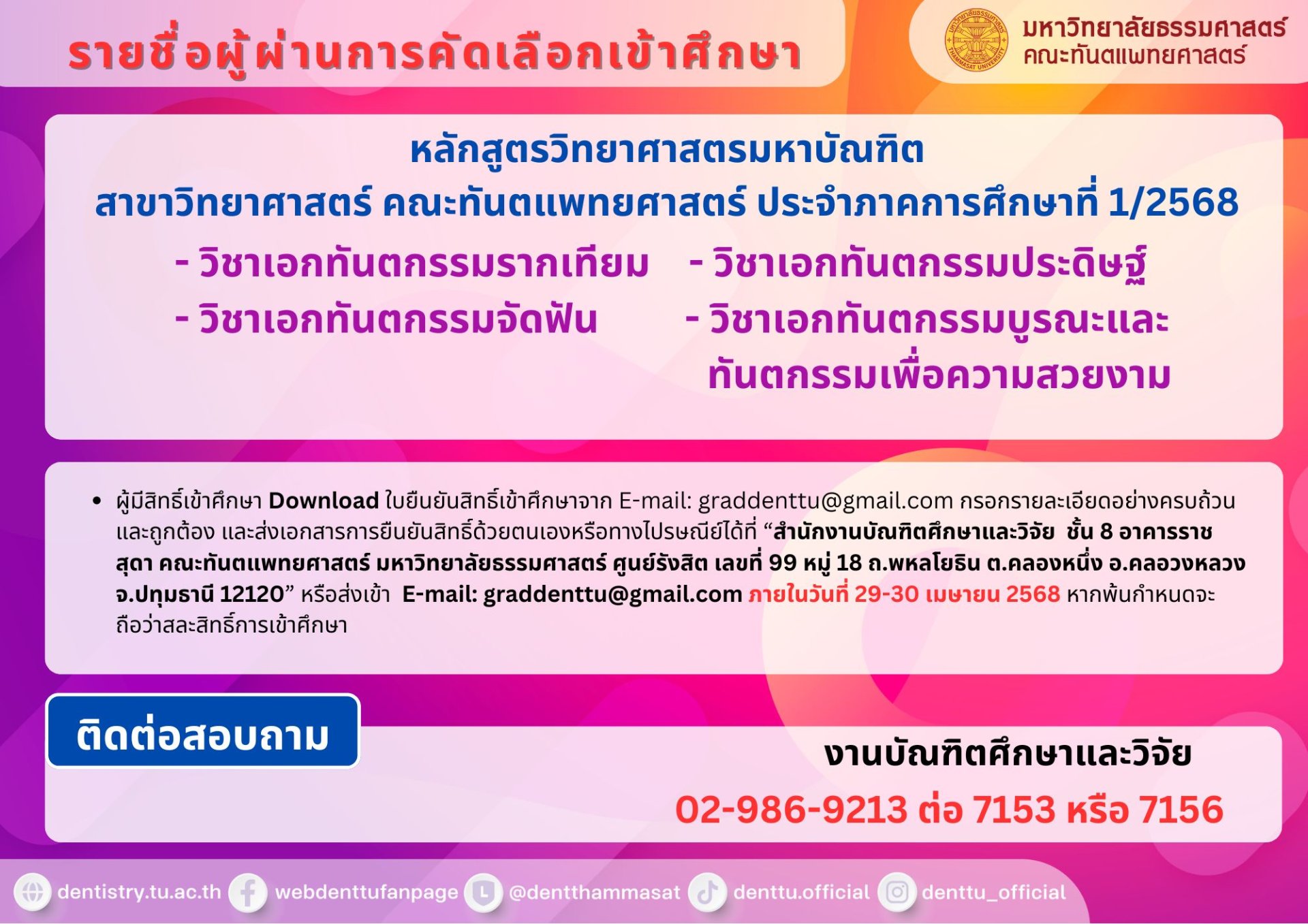 ผู้มีสิทธิ์เข้าศึกษา Download ใบยืนยันสิทธิ์เข้าศึกษาจาก E-mail: graddenttu@gmail.com กรอกรายละเอียดอย่างครบถ้วนและถูกต้อง และส่งเอกสารการยืนยันสิทธิ์ด้วยตนเองหรือทางไปรษณีย์ได้ที่ สำนักงานบัณฑิตศึกษาและวิจัย ชั้น 8 อาคารราชสุดา คณะทันตแพทยศาสตร์ มหาวิทยาลัยธรรมศาสตร์ ศูนย์รังสิต เลขที่ 99 หมู่ 18 ถ.พหลโยธิน ต.คลองหนึ่ง อ.คลอวงหลวง จ.ปทุมธานี 12120 หรือส่งเข้า E-mail: graddenttu@gmail.com ภายในวันที่ 29-30 เมษายน 2568 หากพ้นกำหนดจะถือว่าสละสิทธิ์การเข้าศึกษา