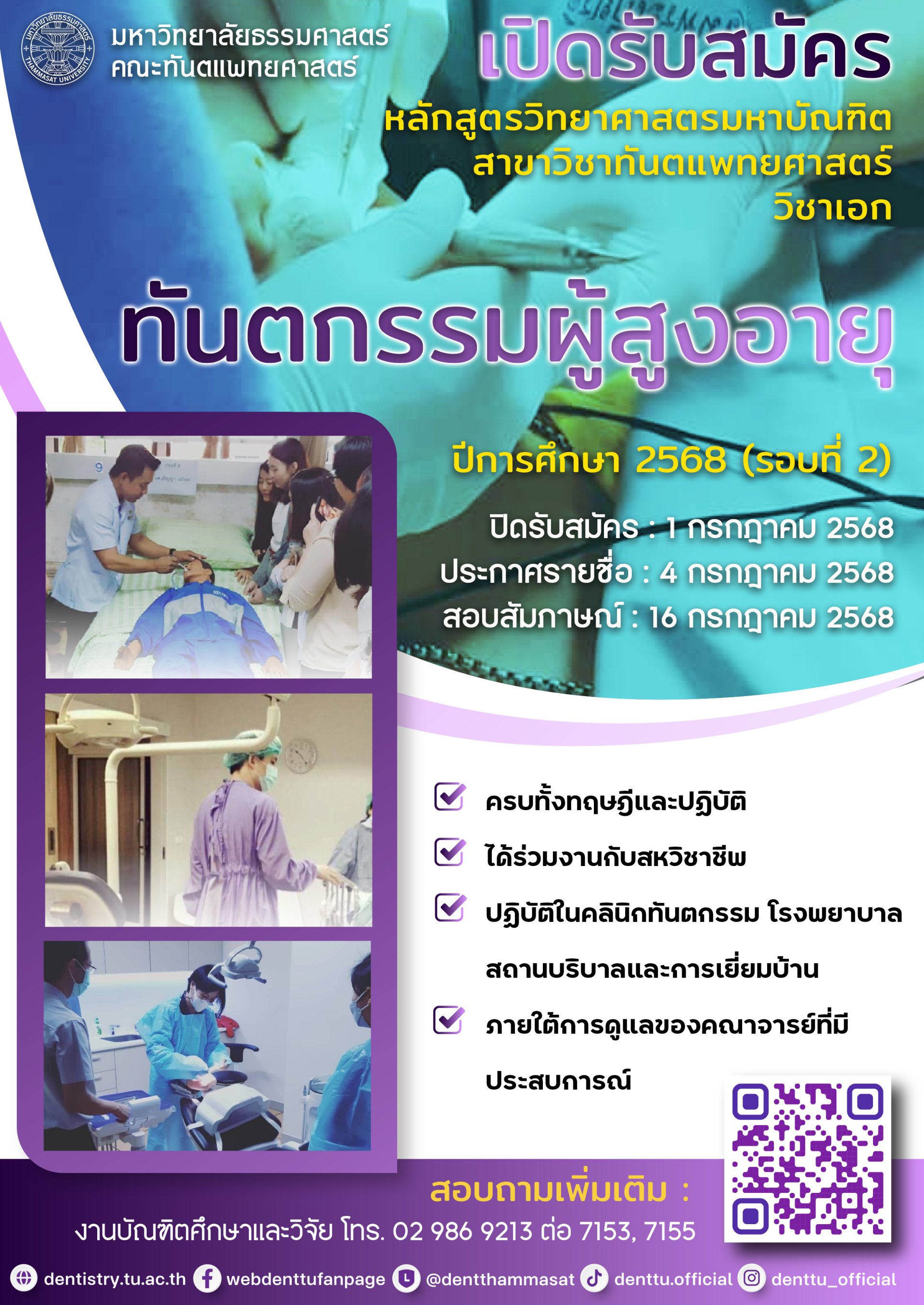 รับสมัครคัดเลือกบุคคลเข้าศึกษาในหลักสูตรวิทยาศาสตรมหาบัณฑิต สาขาวิชาทันตแพทยศาสตร์ วิชาเอกทันตกรรมผู้สูงอายุ คณะทันตแพทยศาสตร์ ภาคการศึกษาที่ 1 ปีการศึกษา 2568 (รอบที่ 2)
