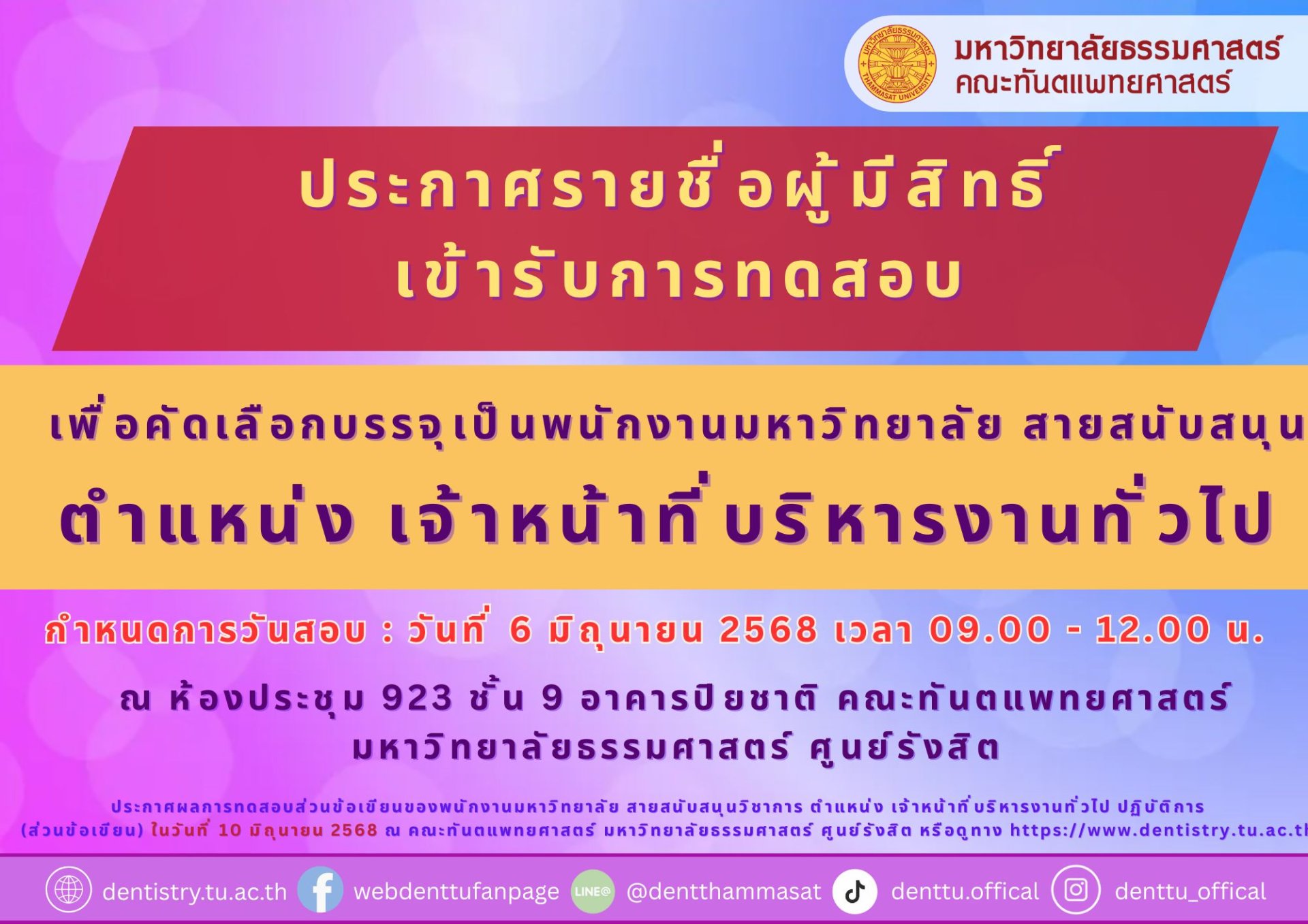 **ประกาศผลการทดสอบส่วนข้อเขียนของพนักงานมหาวิทยาลัย สายสนับสนุนวิชาการ ตำแหน่ง เจ้าหน้าที่บริหารงานทั่วไป ปฏิบัติการ (ส่วนข้อเขียน) ในวันที่ 10 มิถุนายน 2568 ณ คณะทันตแพทยศาสตร์ มหาวิทยาลัยธรรมศาสตร์ ศูนย์รังสิต หรือดูทาง https://www.dentistry.tu.ac.th**