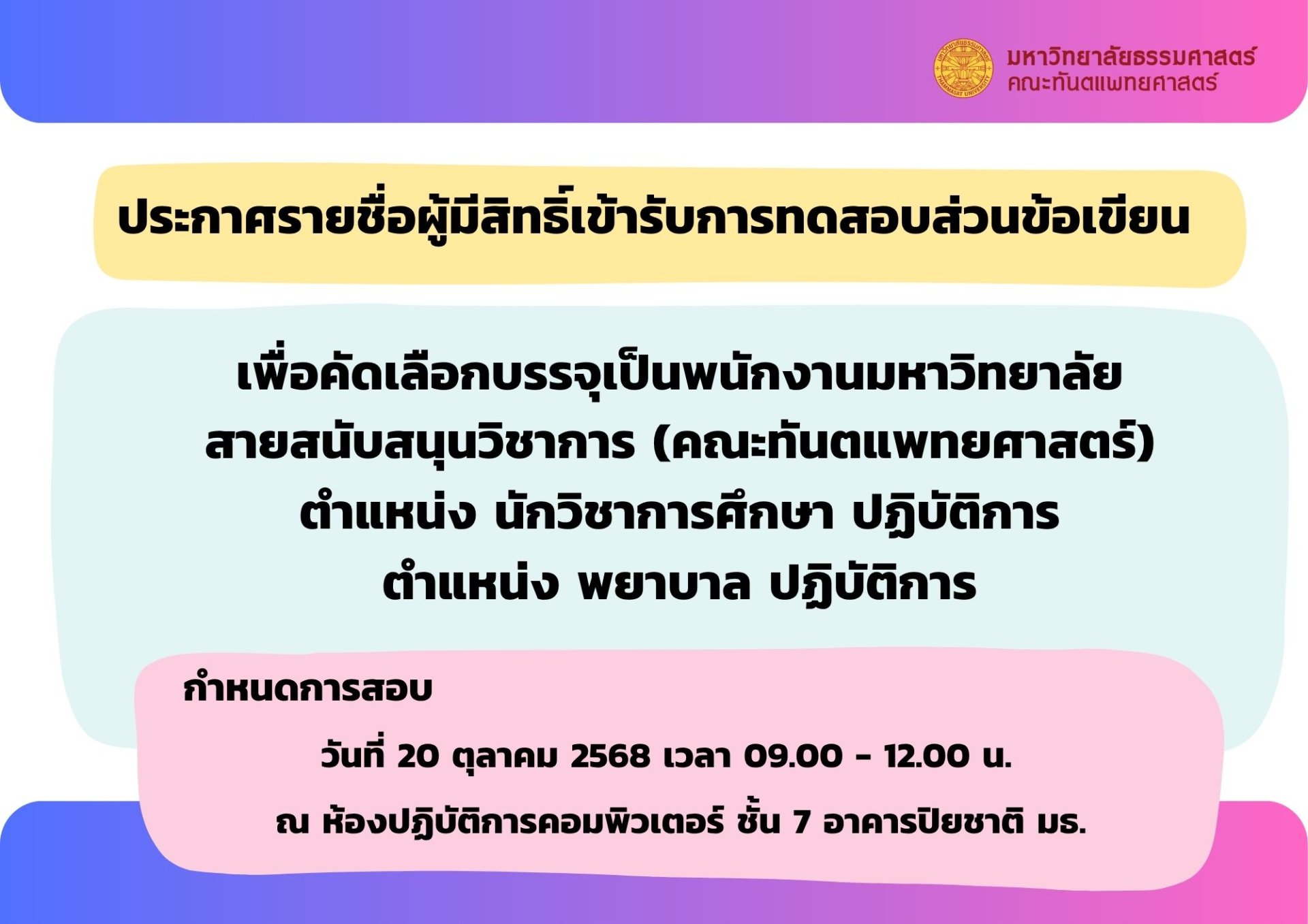 ประกาศรายชื่อผู้มีสิทธิ์เข้ารับการทดสอบส่วนข้อเขียนเพื่อคัดเลือกบรรจุเป็นพนักงานมหาวิทยาลัย สายสนับสนุนวิชาการ (คณะทันตแพทยศาสตร์) ตำแหน่ง นักวิชาการศึกษา ปฏิบัติการ และ ตำแหน่ง พยาบาล ปฏิบัติการ