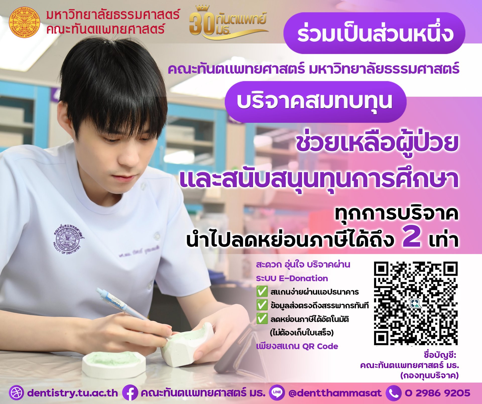 คณะทันตแพทยศาสตร์ มหาวิทยาลัยธรรมศาสตร์ ขอเชิญชวนทุกท่านร่วมบริจาคสมทบทุนเพื่อพัฒนาการศึกษา และช่วยเหลือผู้ป่วย