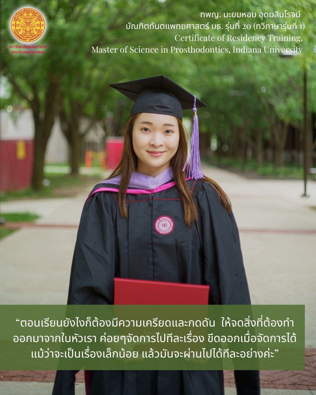 A: ชื่อ ทพญ. มะยมหอม อุดมสินโรจน์ ค่ะ เป็นศิษย์เก่า Dent TU รุ่น 20 และ ทวิภาษา CICM รุ่น 1 ค่ะ ตอนเรียนจบไปใช้ทุนเป็นทันตแพทย์ที่โรงพยาบาลธรรมศาสตร์เฉลิมพระเกียรติ หลังจากนั้นไปเรียนต่อและเรียนจบเฉพาะทางสาขาทันตกรรมประดิษฐ์ใน Certificate of Residency Training และ Master of Science in Prosthodontics ที่ Indiana University ค่ะ